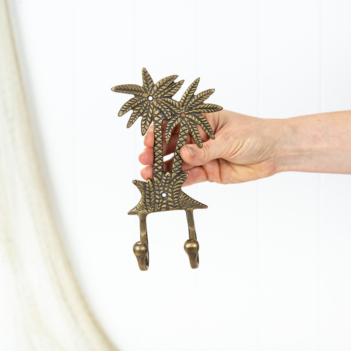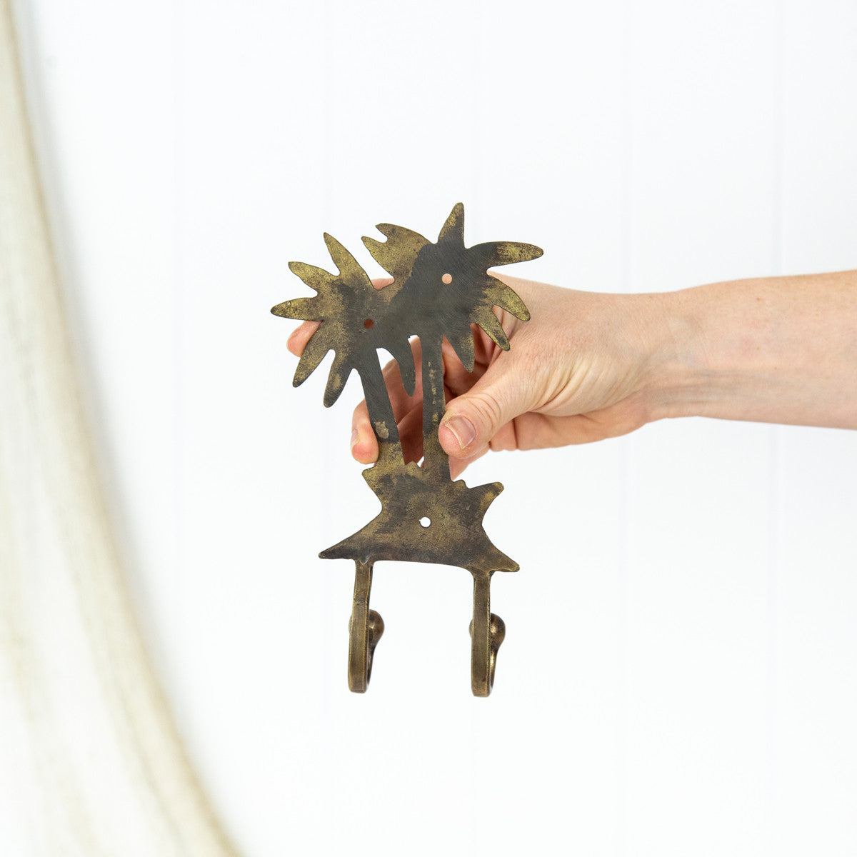 • This hook is made from brass that has been aged to a dark finish. It has two palm trees, and two hooks.
