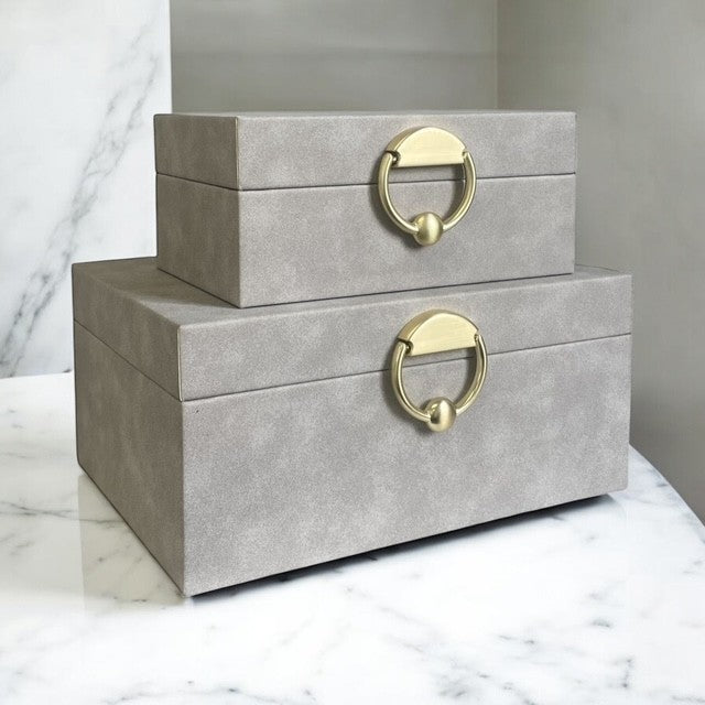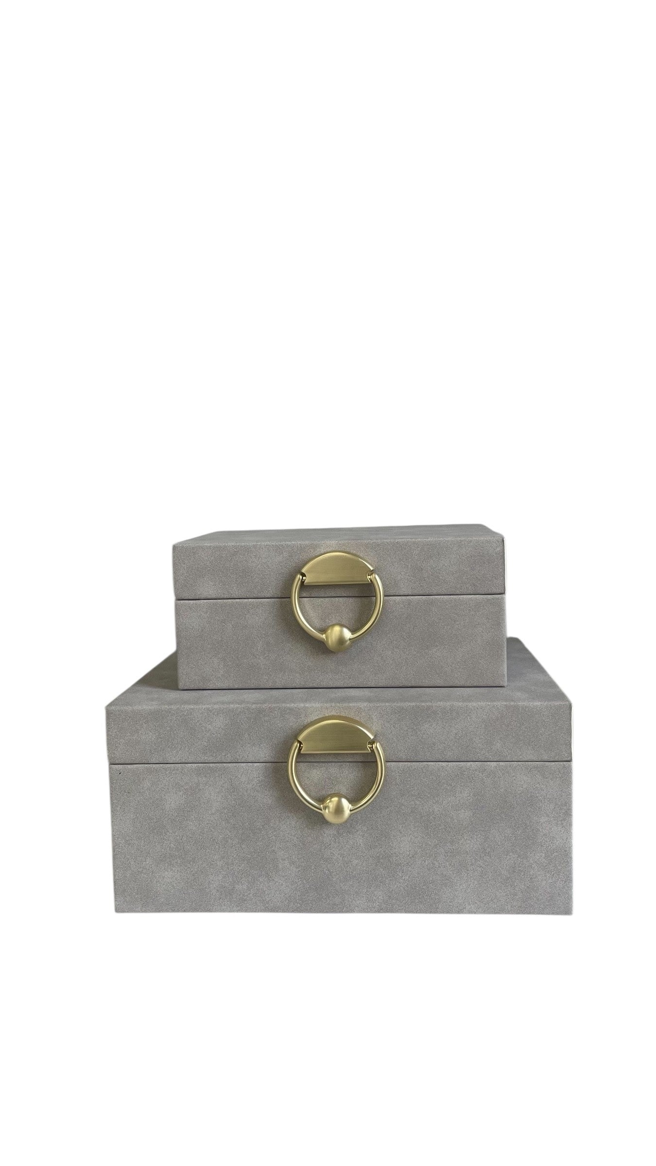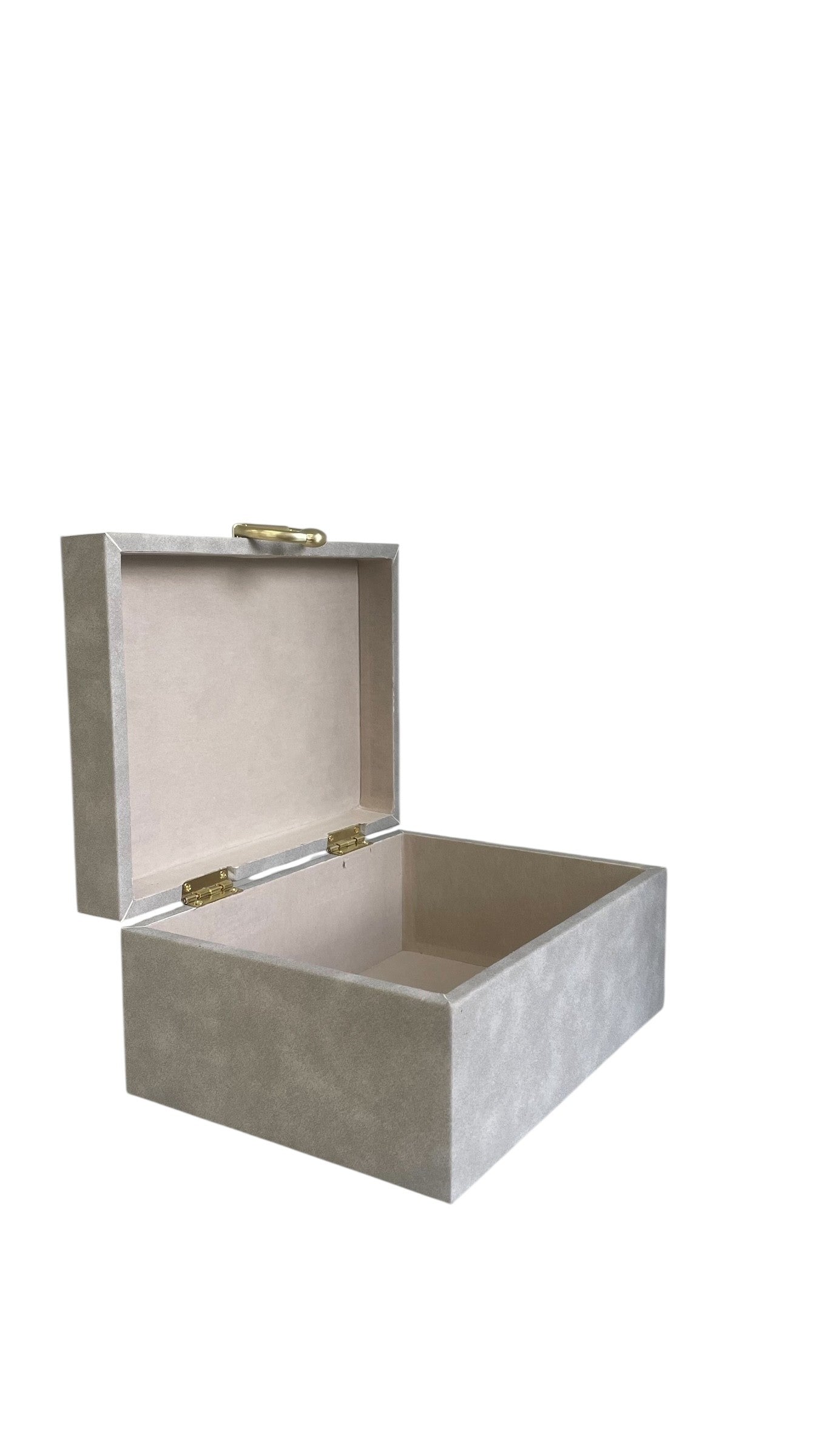 • This large grey sueded look jewel / decor box, accented with brushed gold round latch, offers an elegant storage solution for your treasured accessories. Measuring 24x18x11 cm, its refined finish and spacious interior combine style and practicality, making it a sophisticated addition to any dressing table or vanity.
