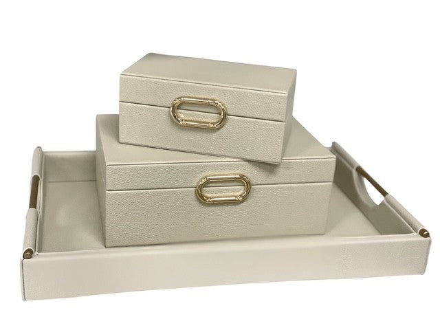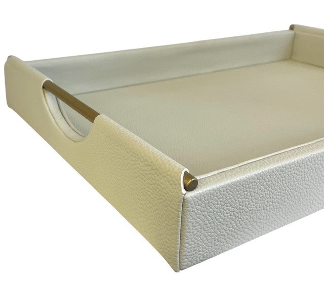 • Elevate your space with this elegant rectangle cream leather-look tray, featuring a sleek gold rod handle. Its refined design combines practicality with a touch of luxury, perfect for serving or stylishly organizing your essentials. A sophisticated addition to any home or office setting.
