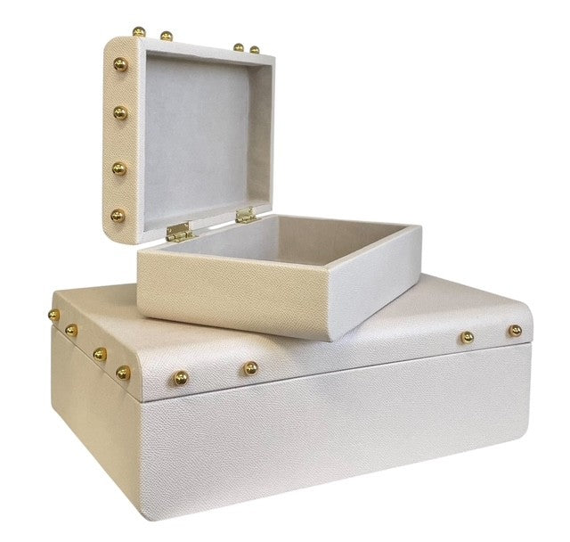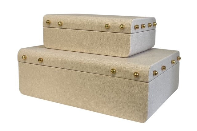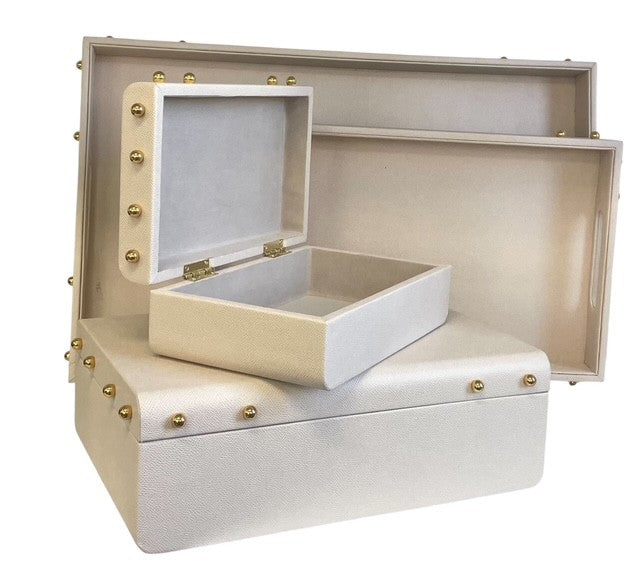 • Elevate your space with the Cream Studded Decor Box, a large 34x22cm piece that combines subtle cream tones with elegant gold studs. This sophisticated storage solution adds a refined touch to any room while keeping your essentials neatly organized. Perfect for enhancing your décor with understated luxury.