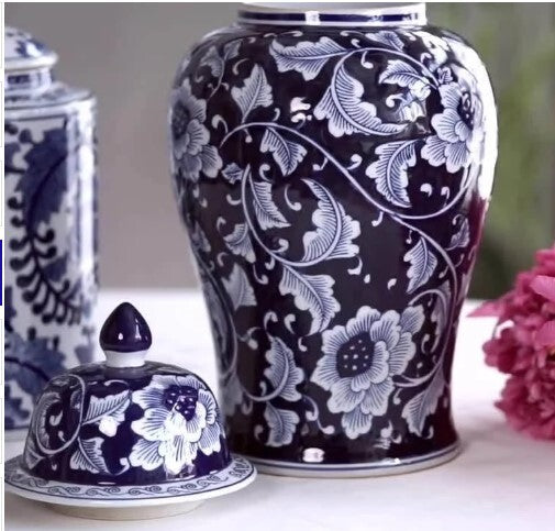 • これは当店で最も人気のあるジンジャージャーです。エレガントな葉と花の模様が描かれた青と白のセラミックジンジャージャー。寸法は24x24x45cmhです。