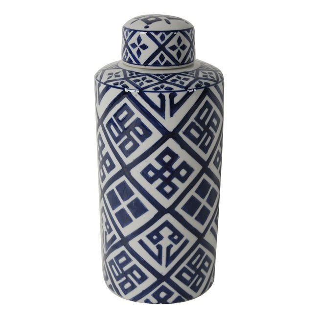 • 美しい幾何学模様のデザインが、この瓶に現代的な個性と洗練されたクラシックな美しさを与えています。光沢のある青と白の仕上げの磁器で作られており、瓶自体のエレガントな形を圧倒することなく、色が際立っています。高品質の磁器構造、深い青のデザインが施された白い釉薬。