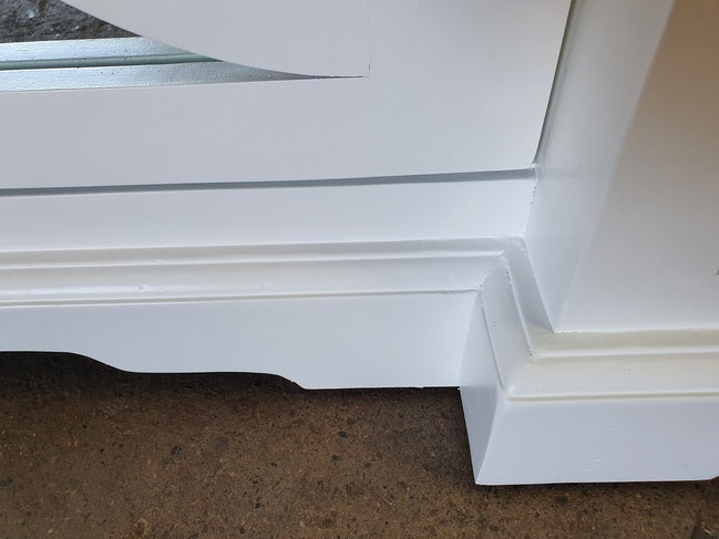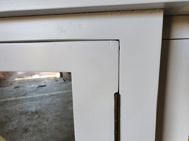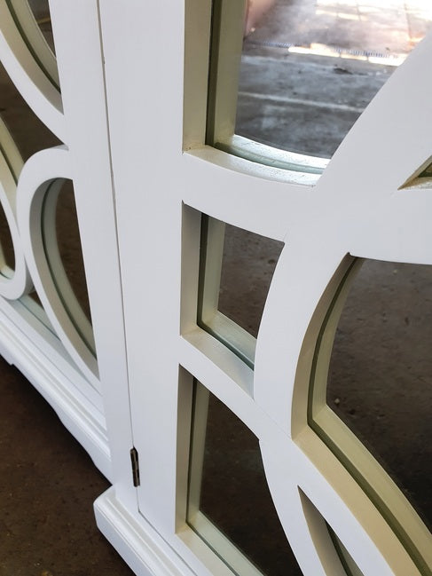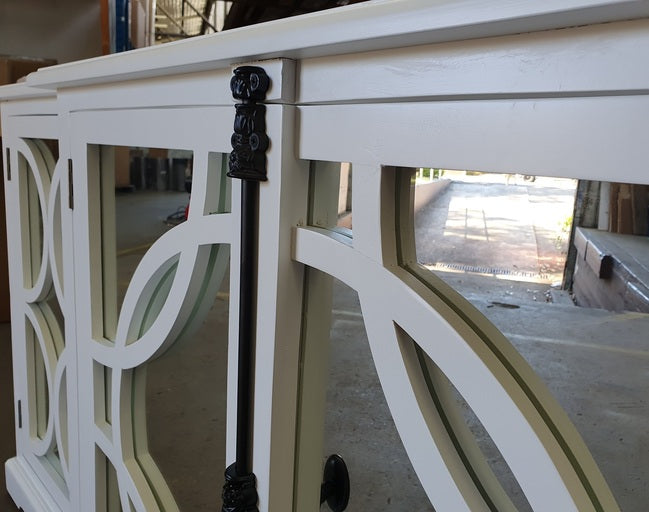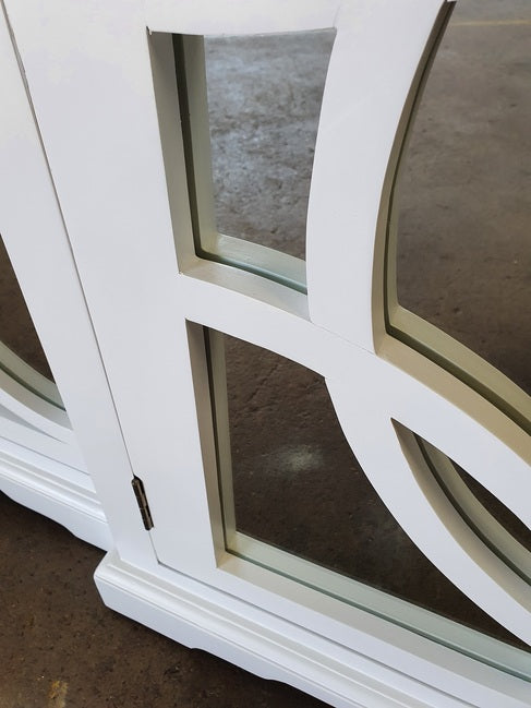 • これは見事な 4 ドアの白いサイドボード キャビネットです。アルダー材で作られ、白く塗装され、鏡の扉と円形のオーバーレイ デザインが特徴で、存在感のある一品です。当社の製品はすべて手作りのため、多少の欠陥は製品の一部であることをご了承ください。