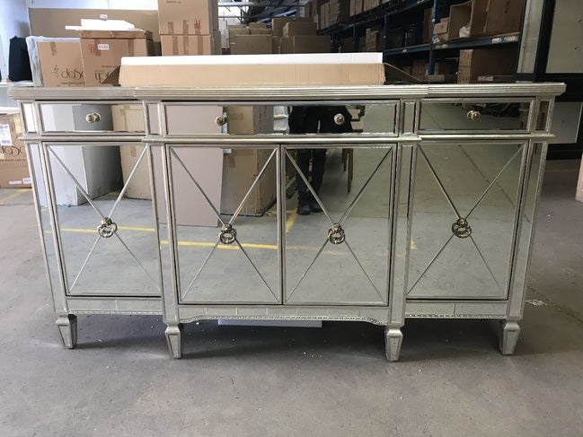 • このミラーサイドボードは、アンティークシルバー/ゴールドの箔トリムで覆われた、本物の風合いを醸し出す、WOW 要素 (ステートメントピース) が満載です。引き出し 3 つと内部棚付きのドア 4 つで、リネンから大皿までたっぷり収納できます。ステートメントミラー家具を組み込むことで、ミラーの反射効果をさらに活用できます。当社のビュッフェは、ハリウッドとアールデコのインスピレーションのグラマラスを取り入れています。ノスタルジックなデザインは、アンティークシャンパンのモールディングとハードウェアを備えたミラーパネルが特徴です。マンハッタンスタイルで部屋を控えめにしたり、フランス風の家具とミラーやアクセサリーのゴールドやシルバーの重厚なアクセントでパリの雰囲気を加えたりできます。178cm ブレークフロント 4dr 4 ドア ブレークフロント