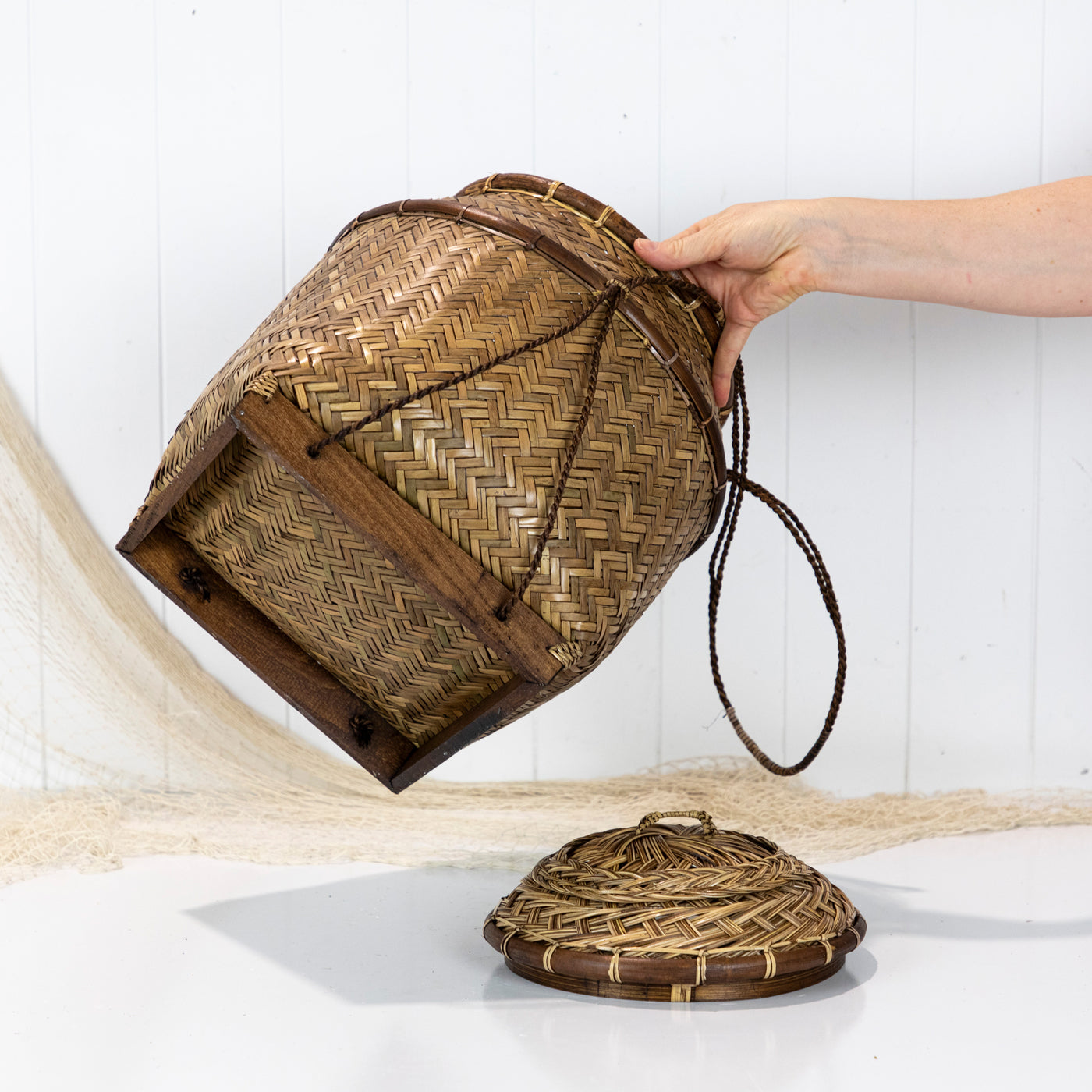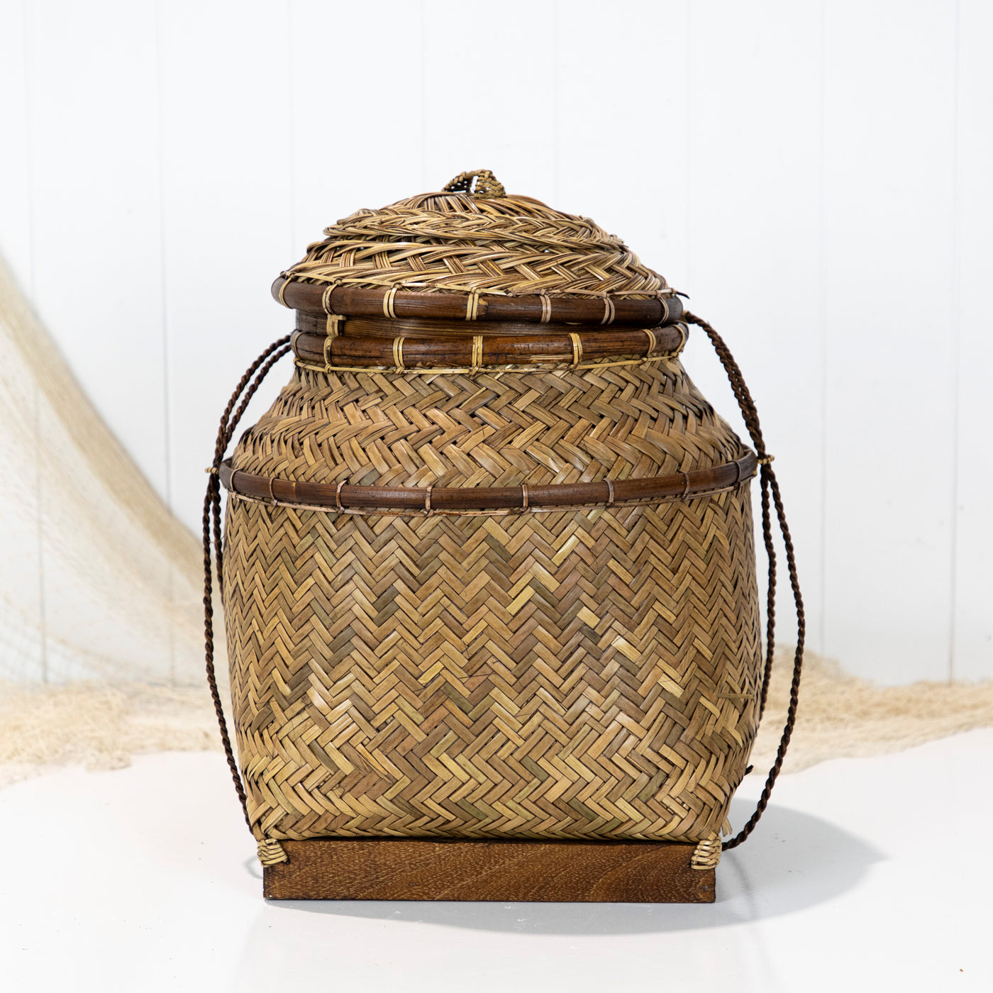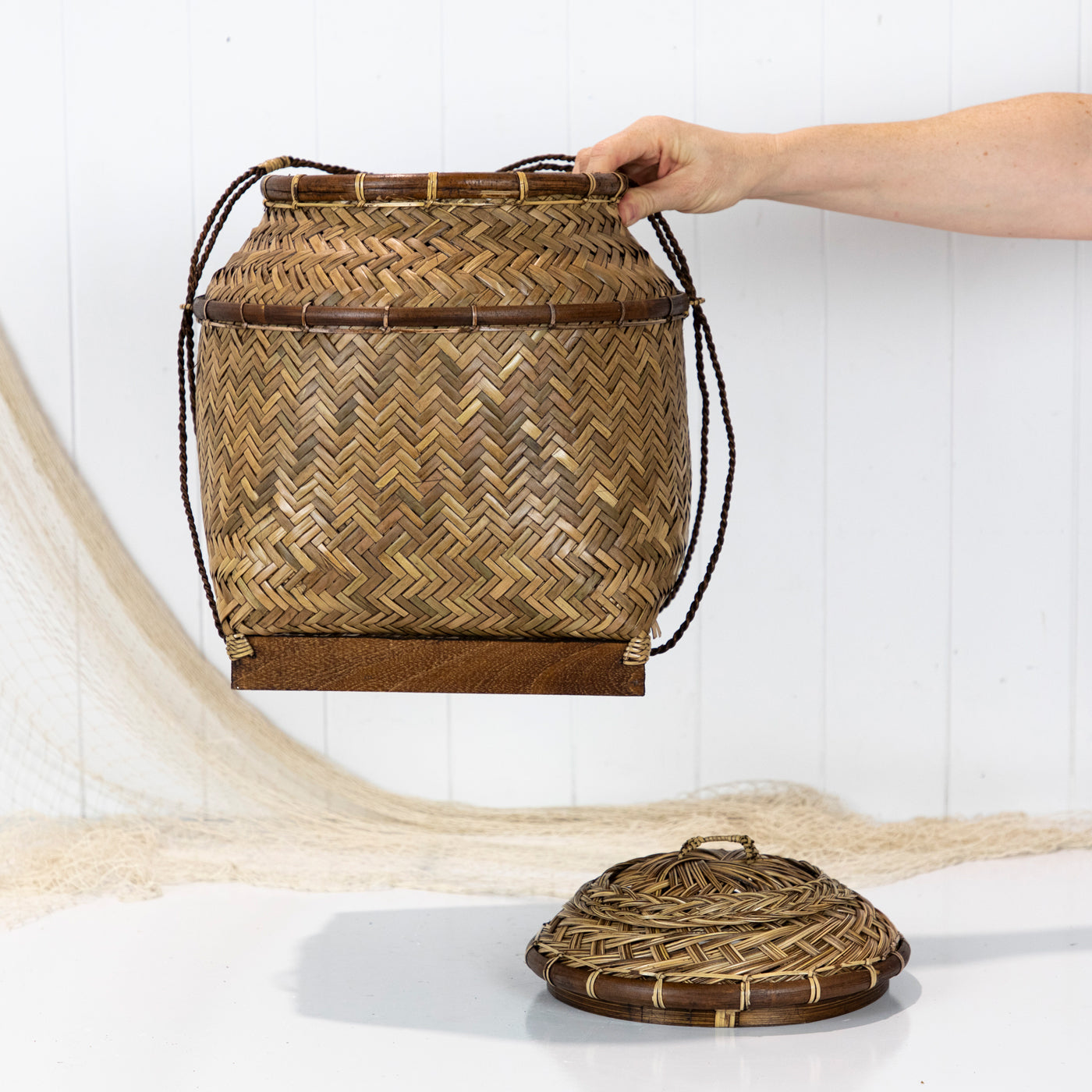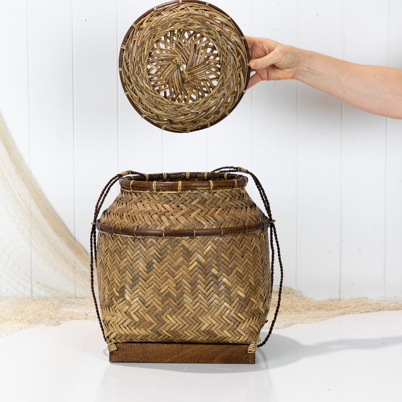 Beautifully woven, it has carry straps and lid. The base is made form timber.