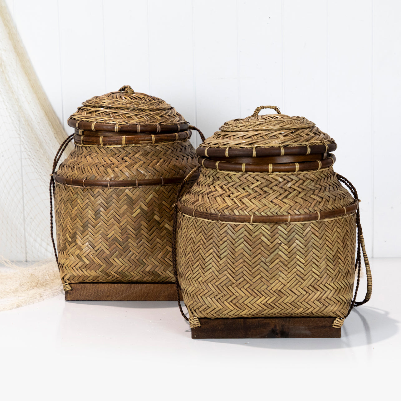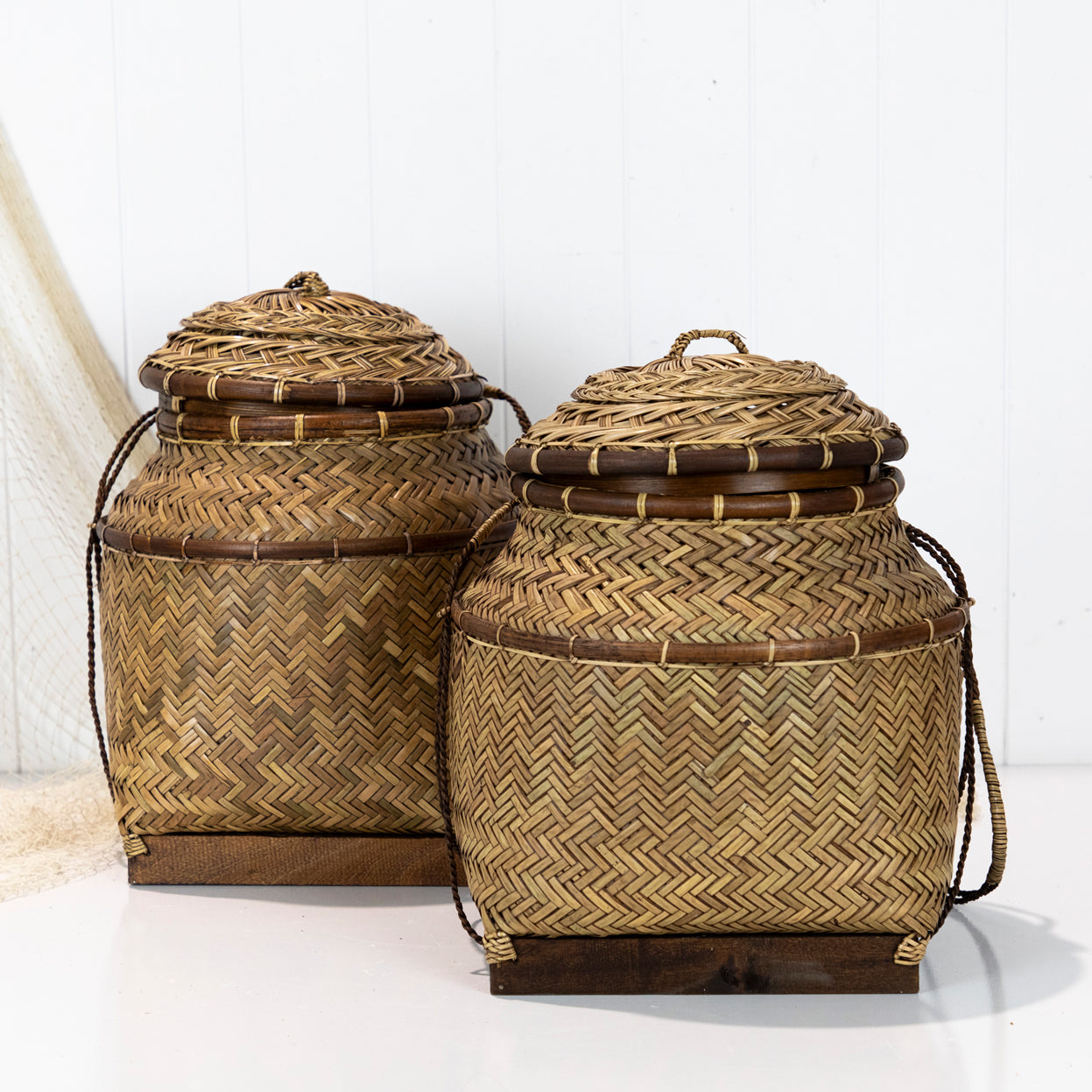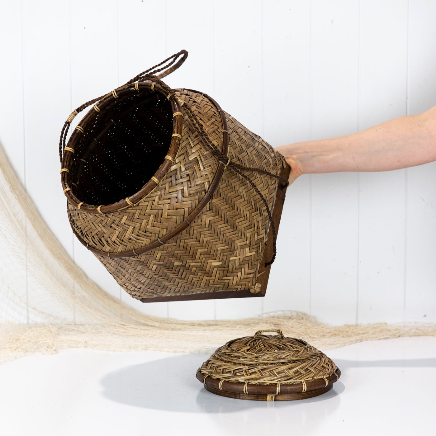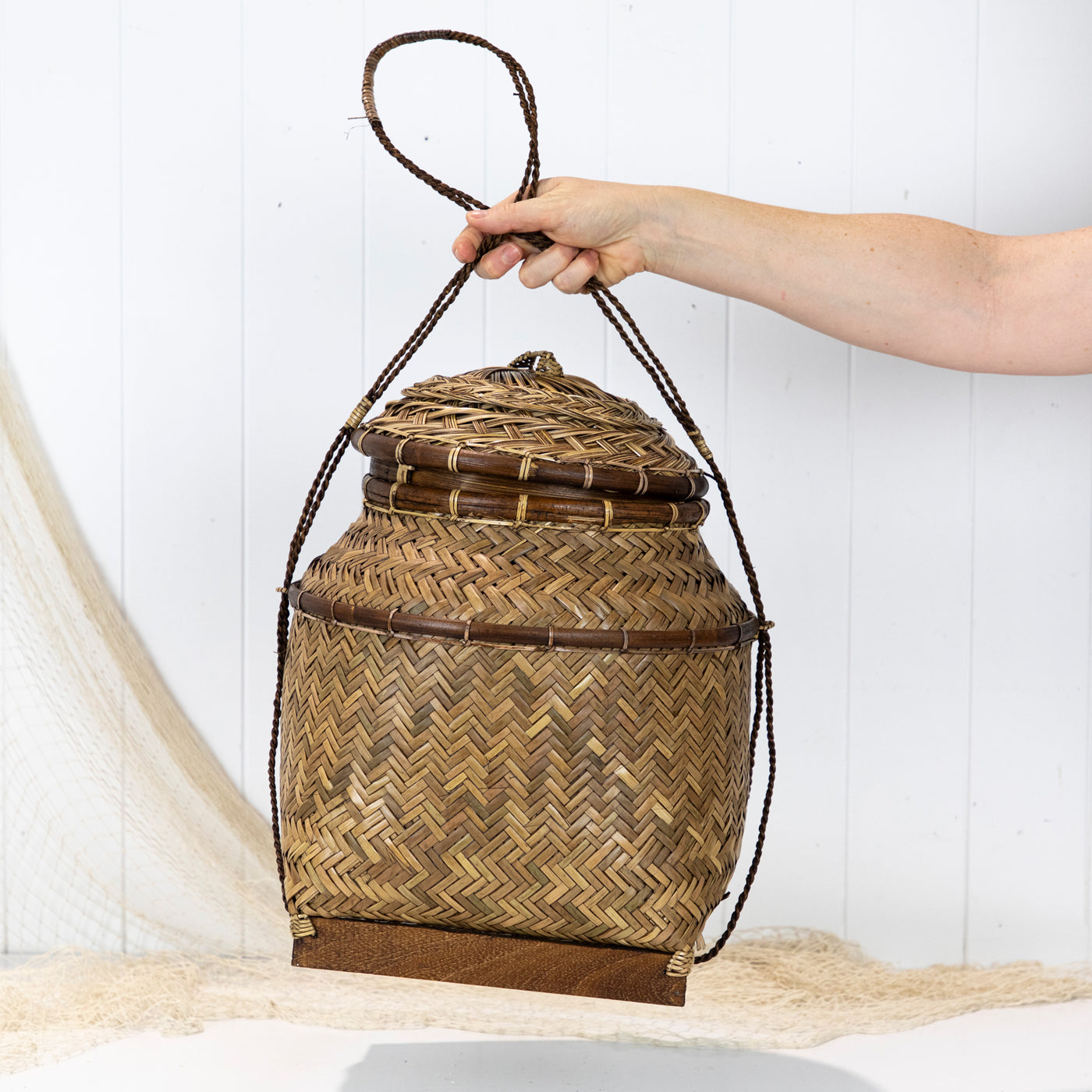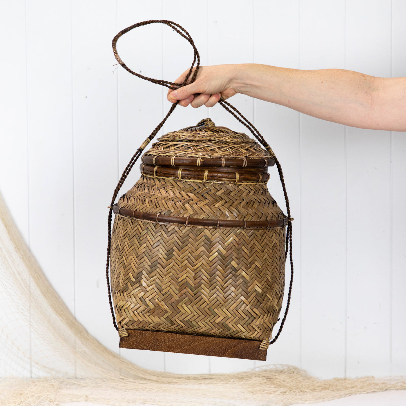 Beautifully woven, it has carry straps and lid. The base is made form timber.
