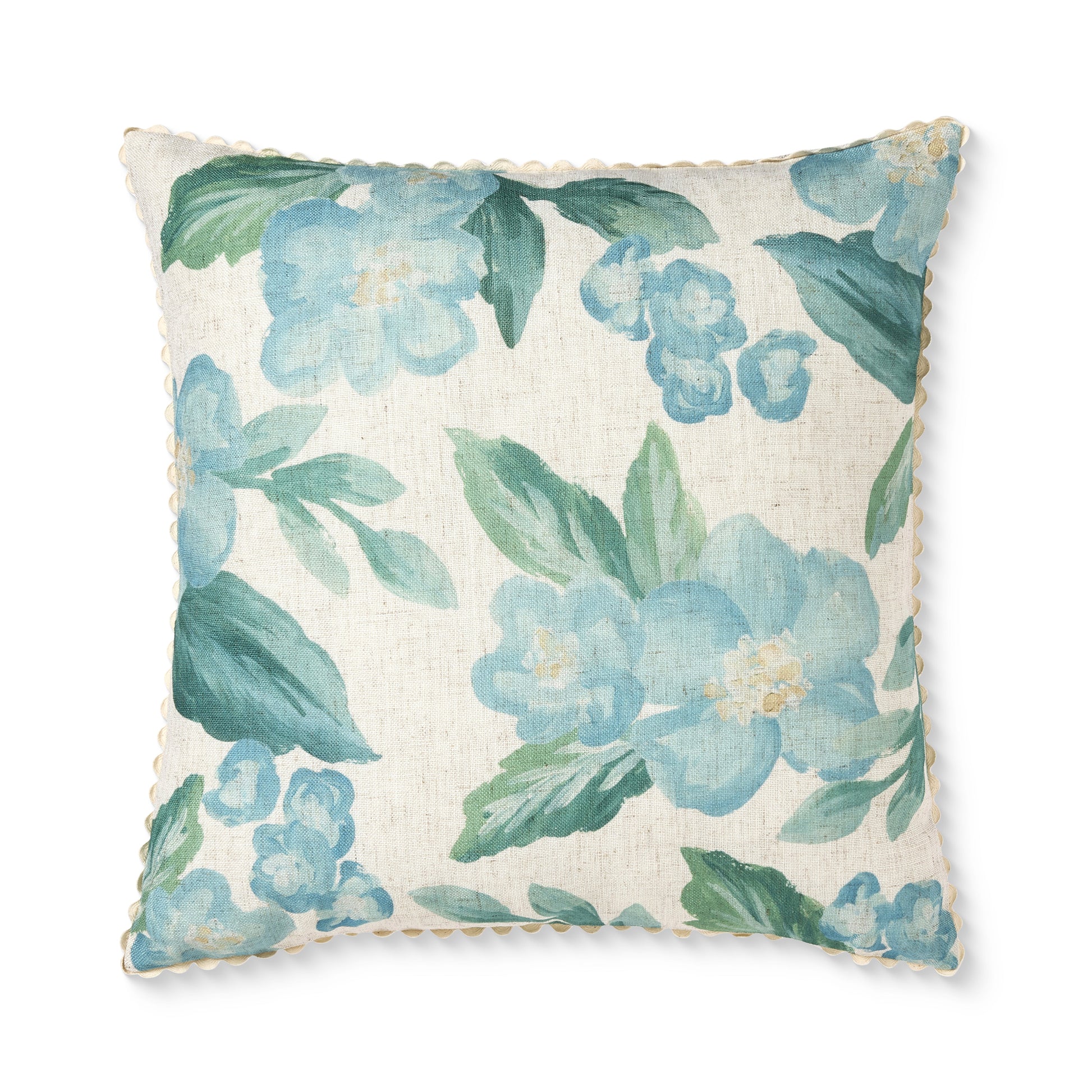 • Hand painted large scale blue and green floral on natural background with natural reverse and ric rac trim.