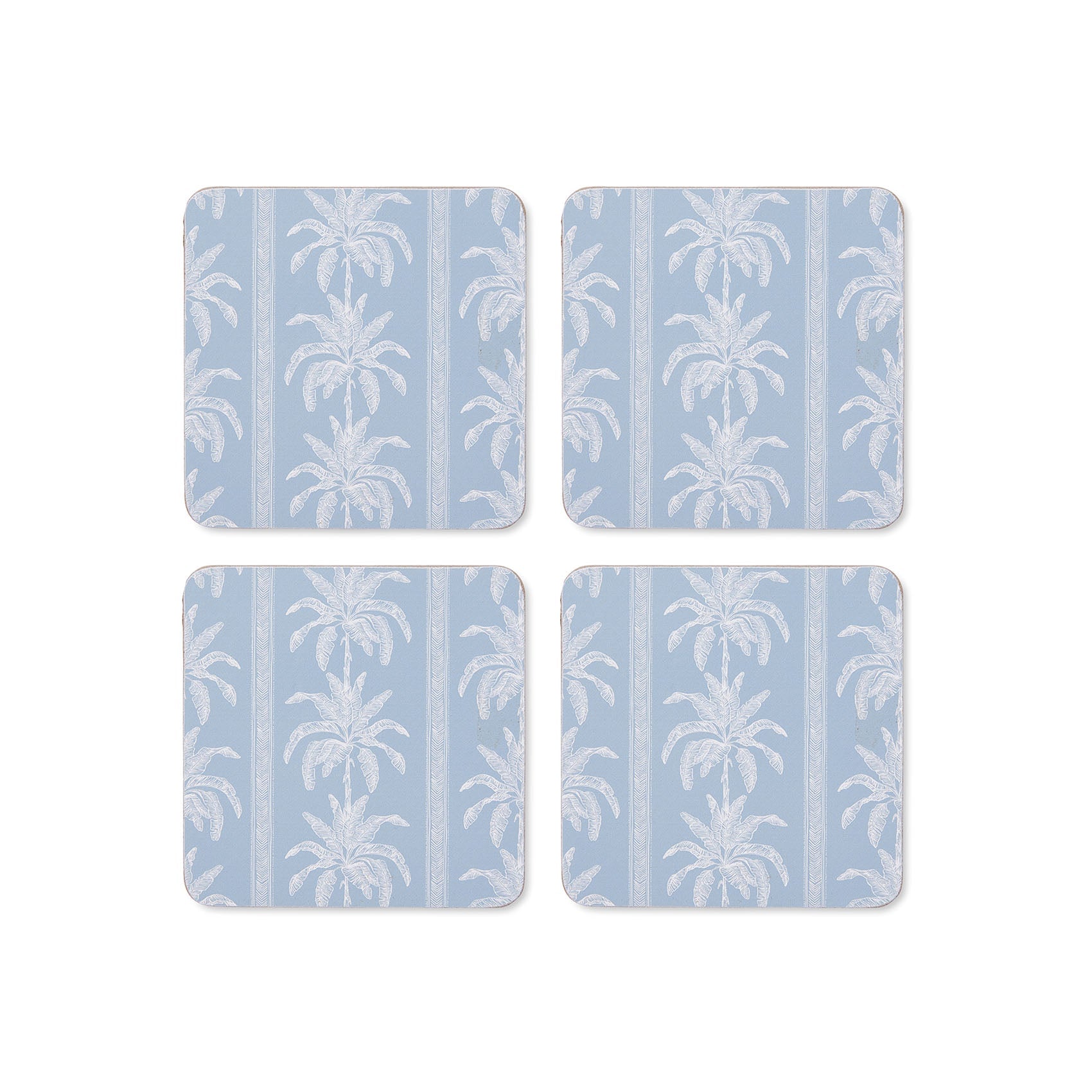 • These cork backedcoasters are the perfect combination of function and style. Packed as a set of four, they feature a block printed palm design on a pale bluebackground.