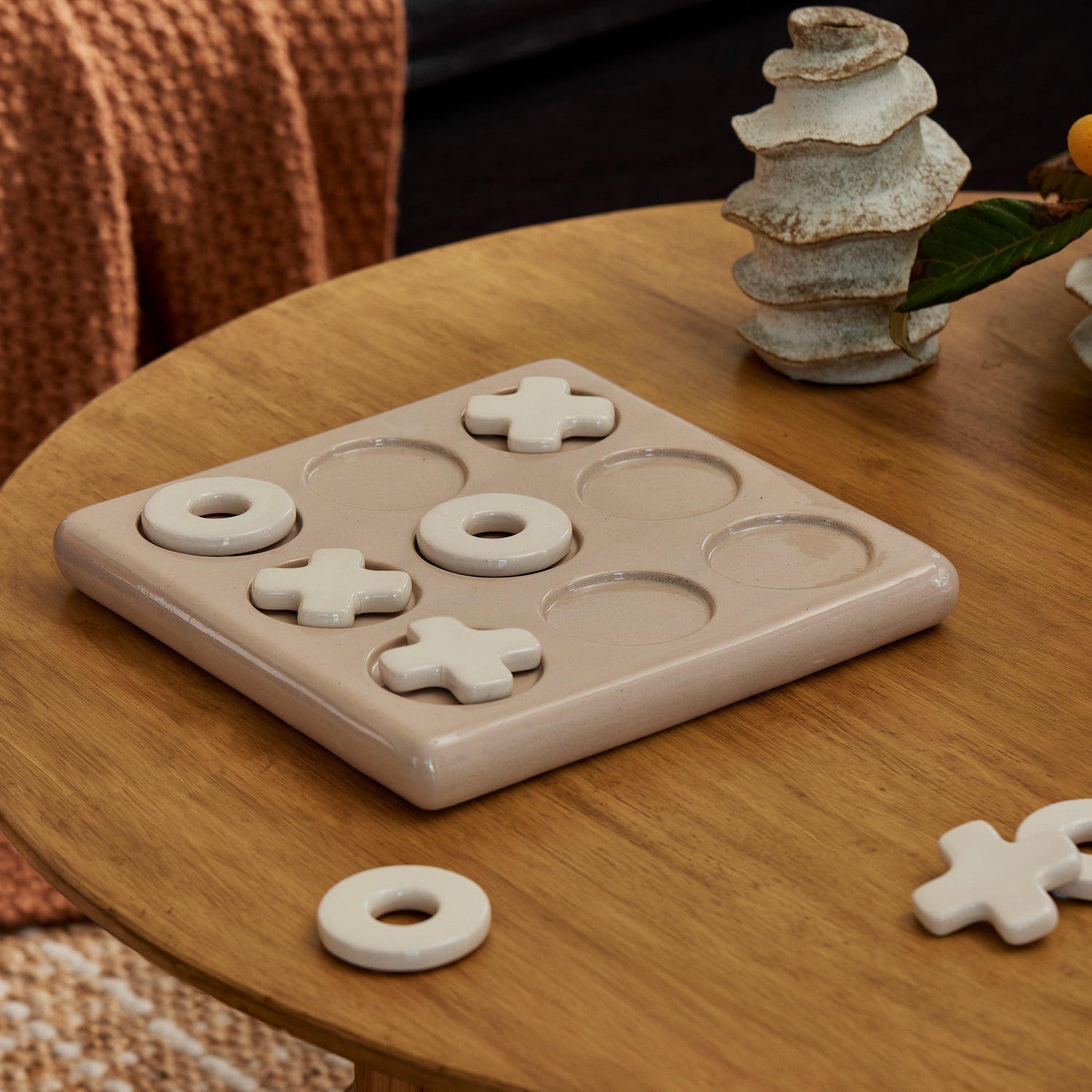 • Ceramic tic tac toe decor piece. Sand coloured glossy base with cream noughts and crosses.