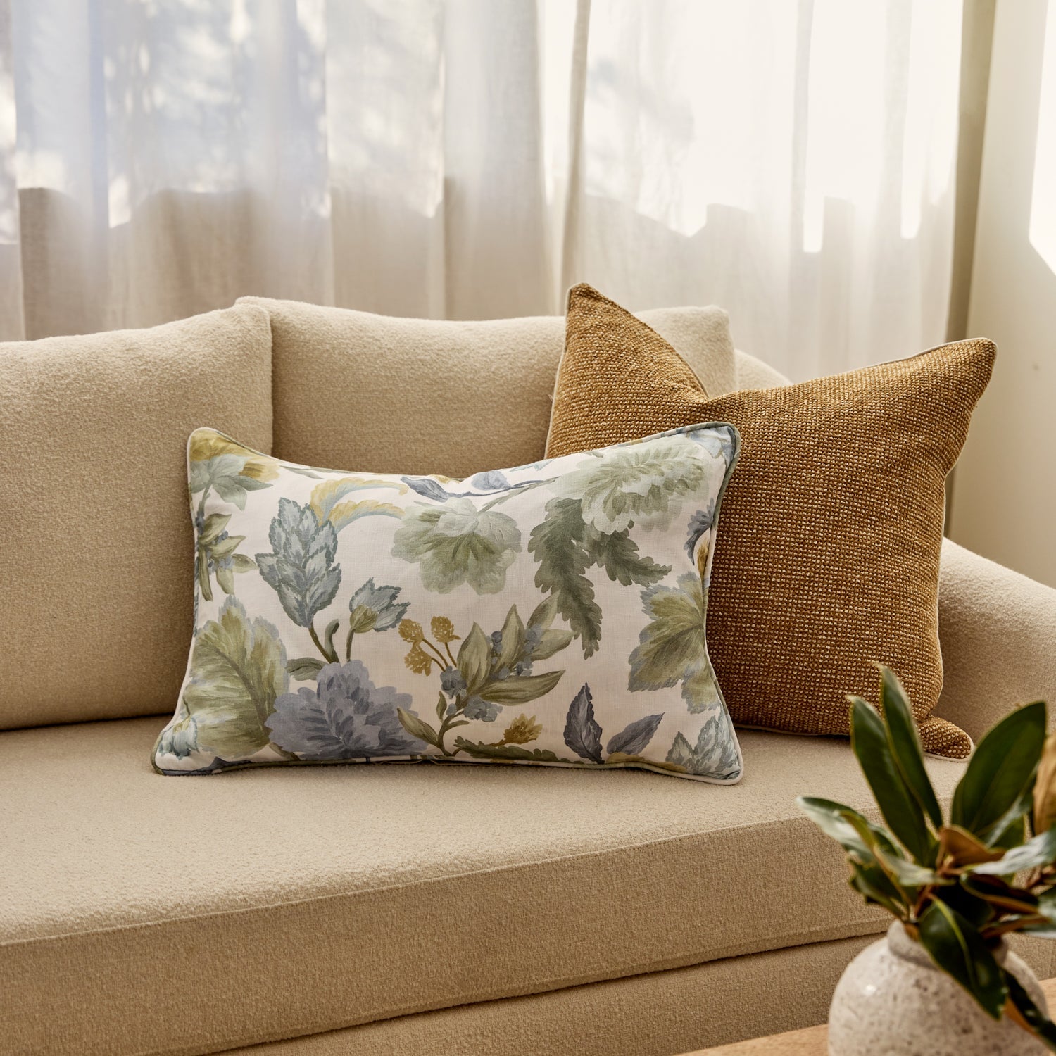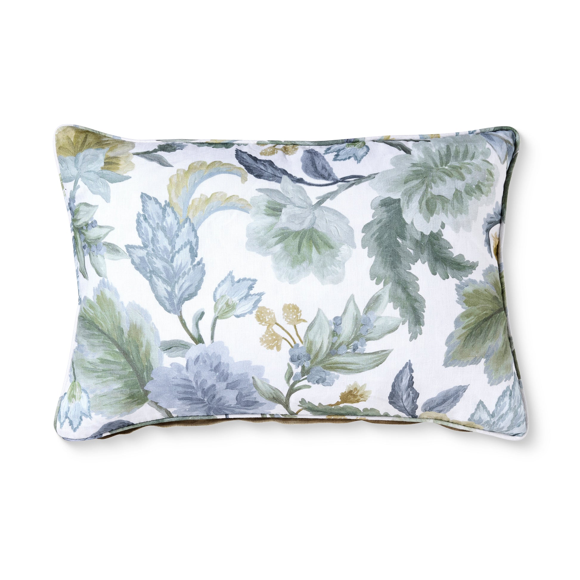 • Hand-painted blue and green floral print linen lumbar cushion.