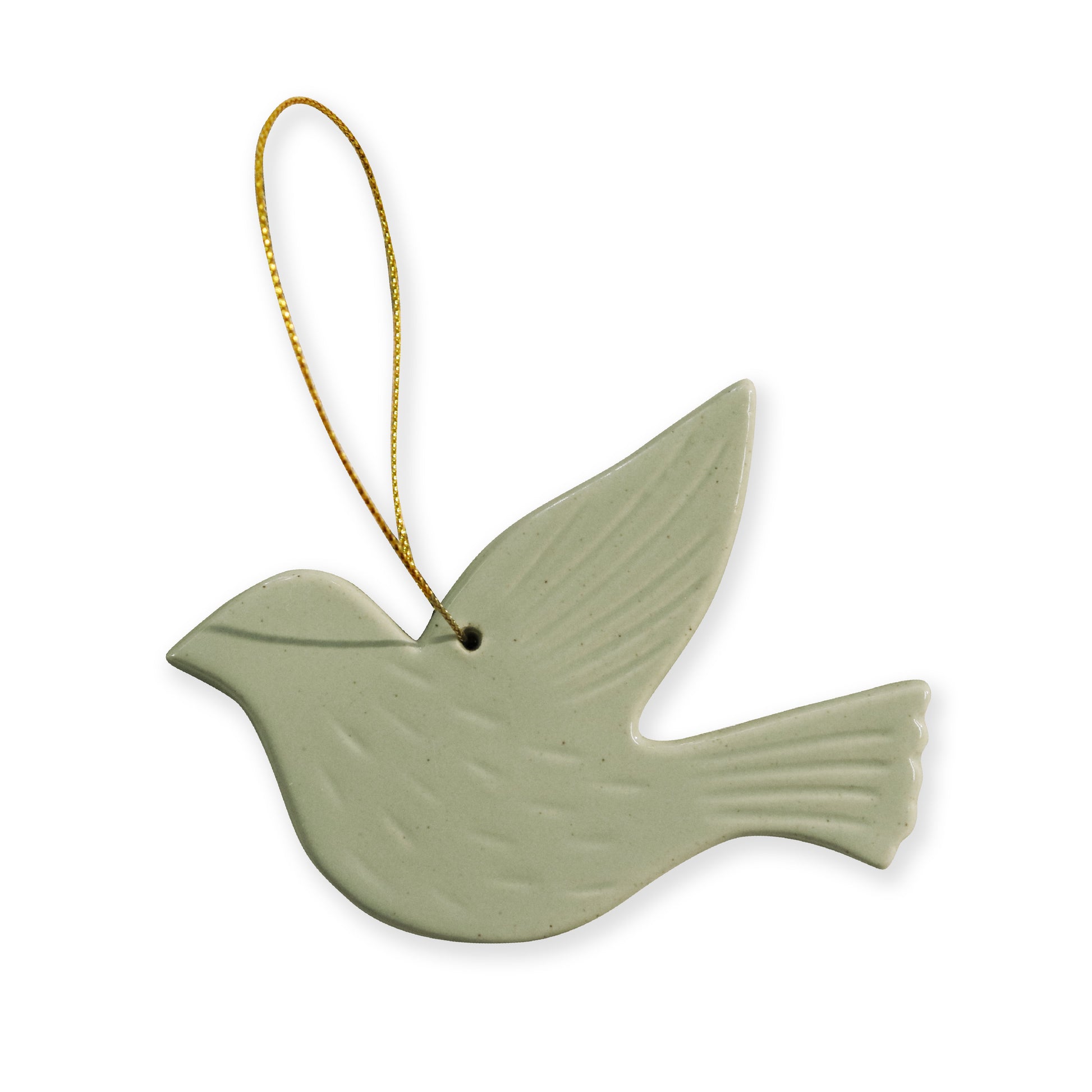 • Delicate engraved dove decoration in a sage speckle glaze with gold string.