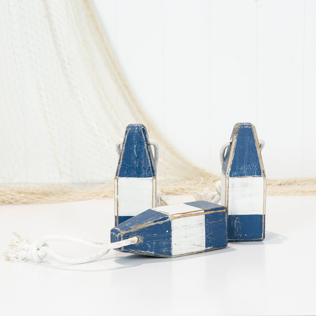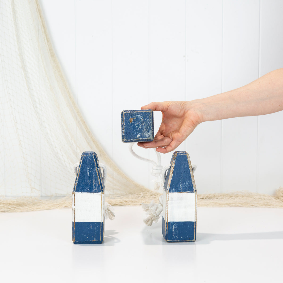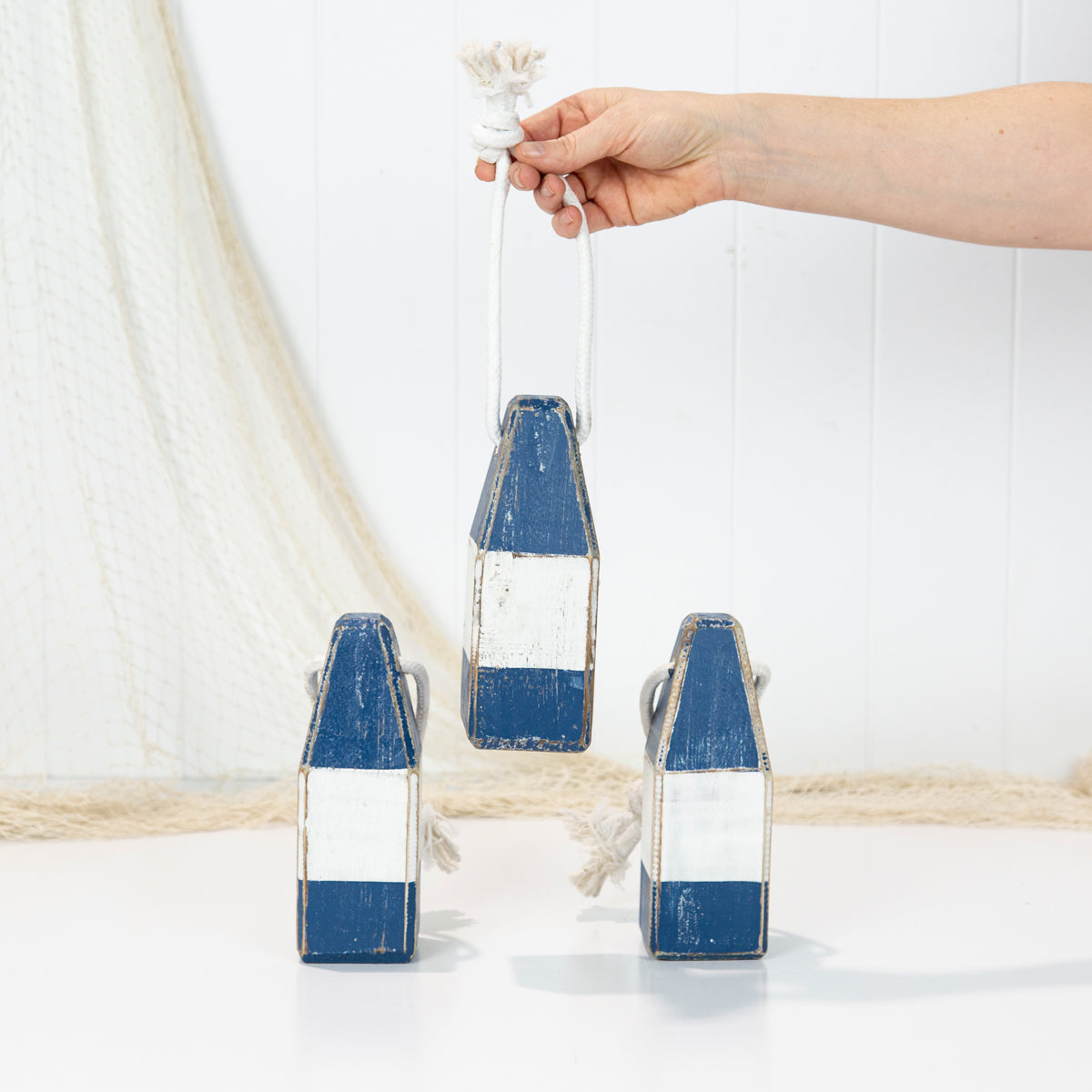 • クラシックなロブスター ポットのデザインを彷彿とさせる、丁寧に作られた木製のブイで、海岸の魅力に浸ってください。落ち着いた青と白の色合いで飾られたブイは、熟練の職人の手によって研磨され、素朴な仕上がりを実現し、時代を超えた海辺の魅力を呼び起こします。