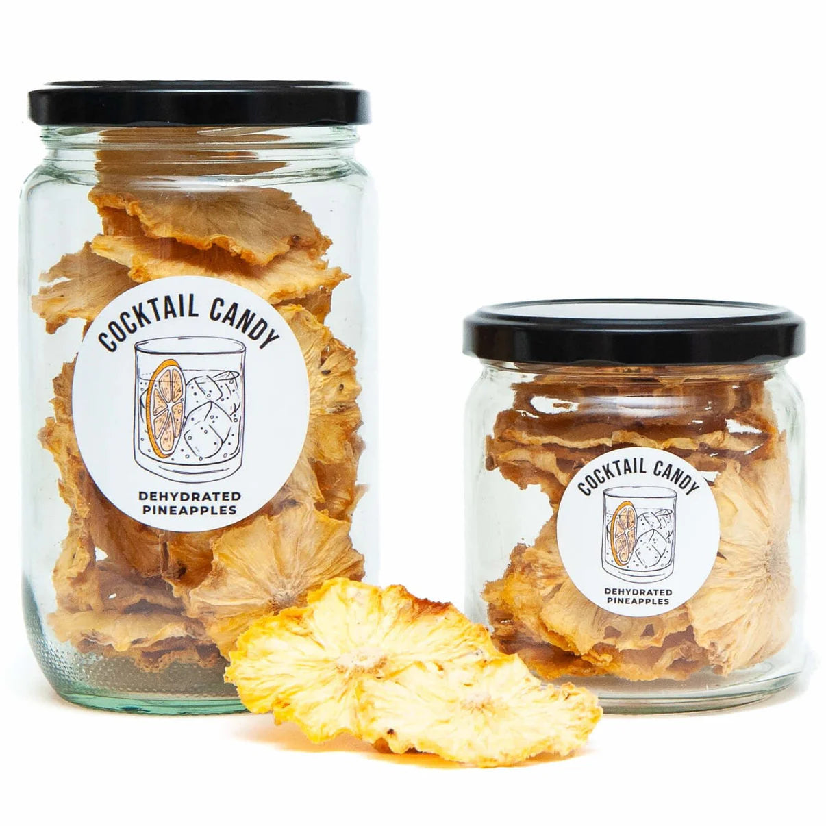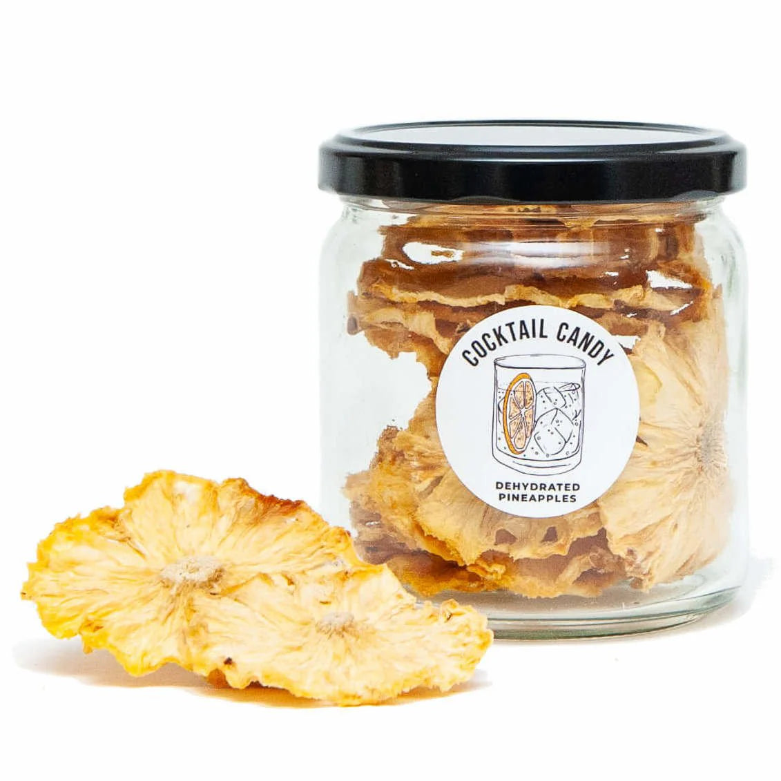あらゆるサイズのパイナップルを乾燥させます。重量で販売するよう努めていますが、サプライヤーの生産物にはさまざまな形やサイズがあるため、スライスの数は異なります。乾燥させたパイナップルは平らではなく、きれいに積み重ねられません。物理的に可能な限り多くのスライスを瓶に詰めます。