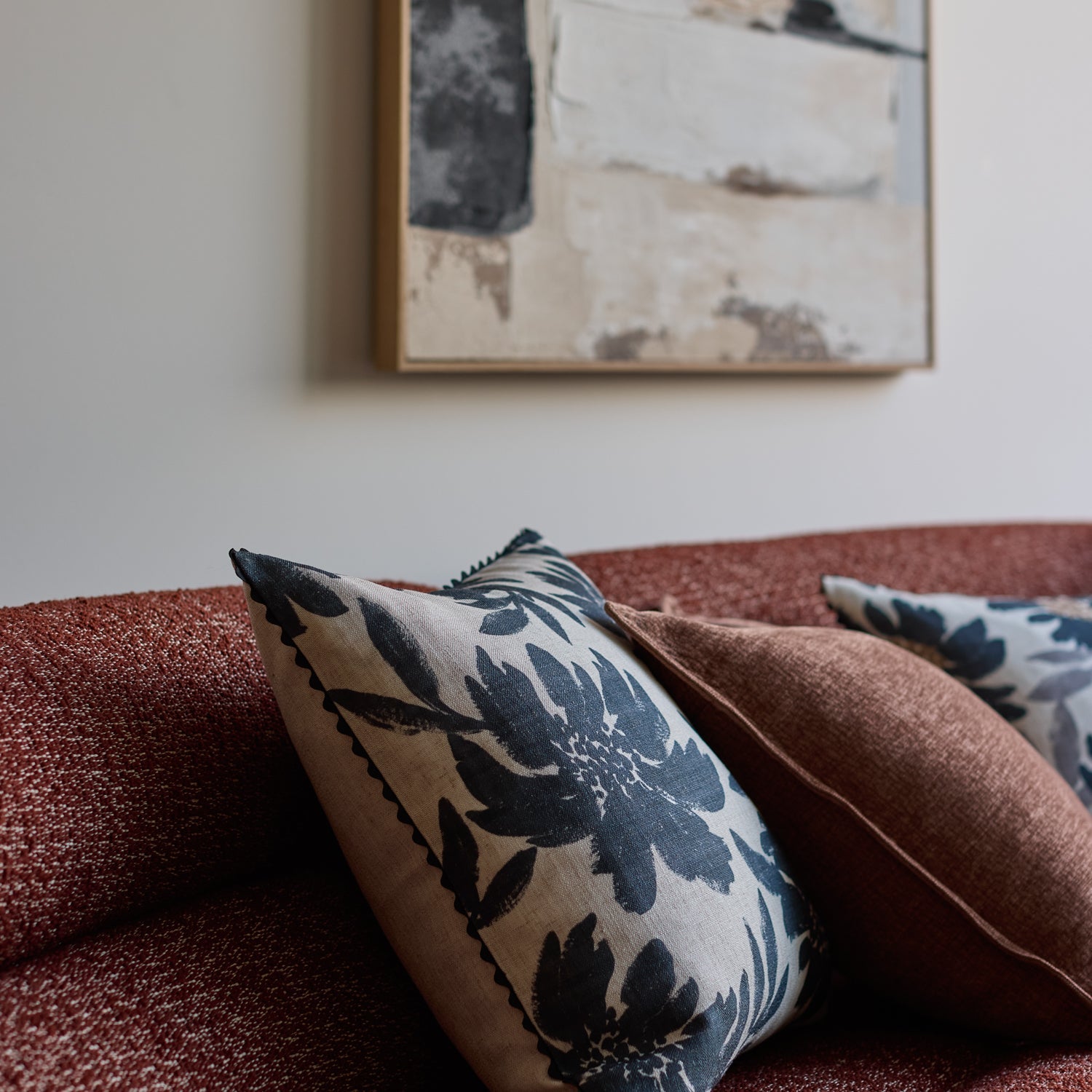 • Hand-painted black floral printed on a natural background with natural reverse and black ric rac trim.