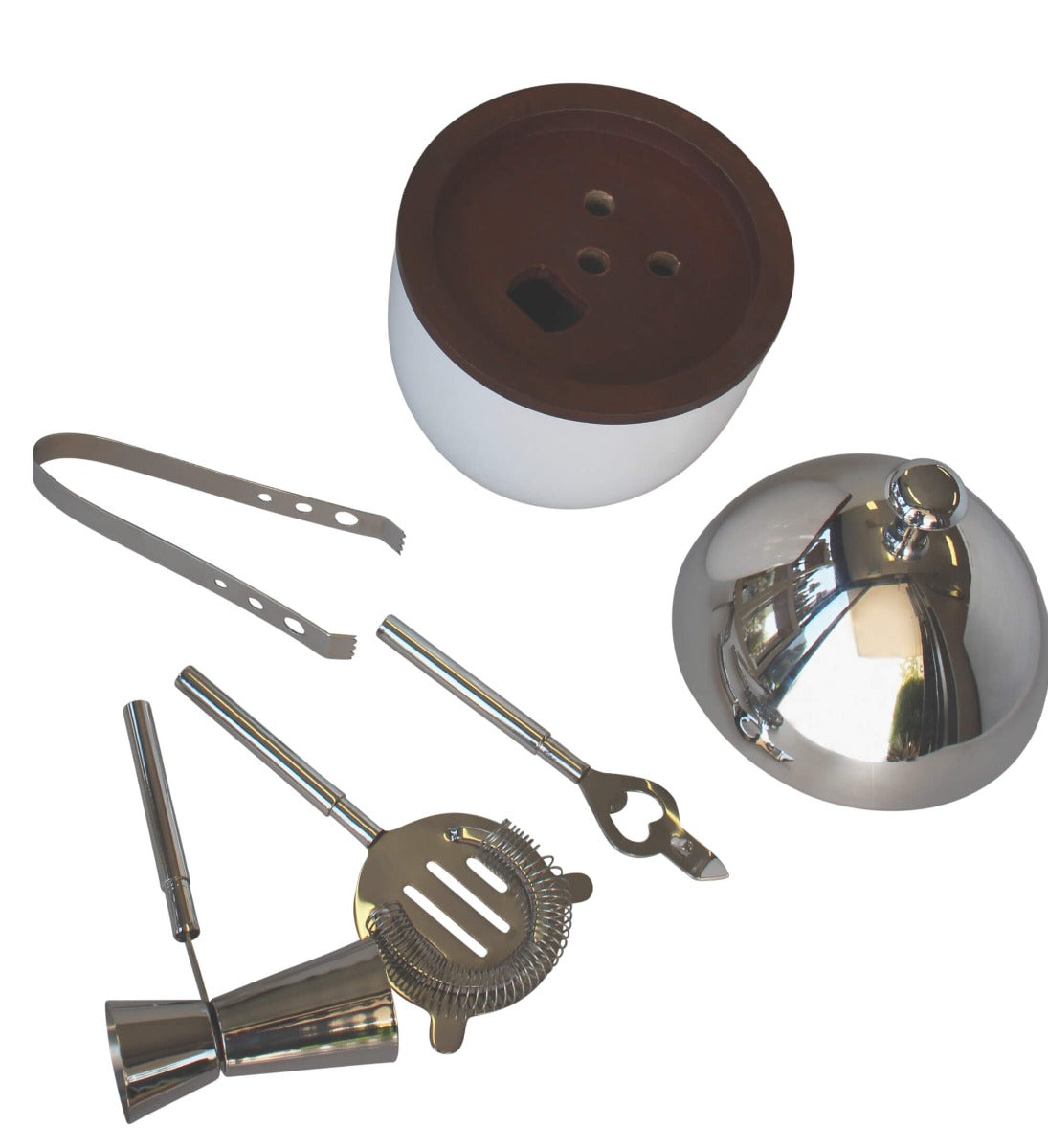 Indulge in the luxurious PARTY EGG WHITE AND STAINLESS COCKTAIL SET, featuring a double wall ice bucket with an internal stand INCLUDING ALL YOUR cocktail utensils. Experience sophistication and elegance with its dimensions of 26x16.5cm.