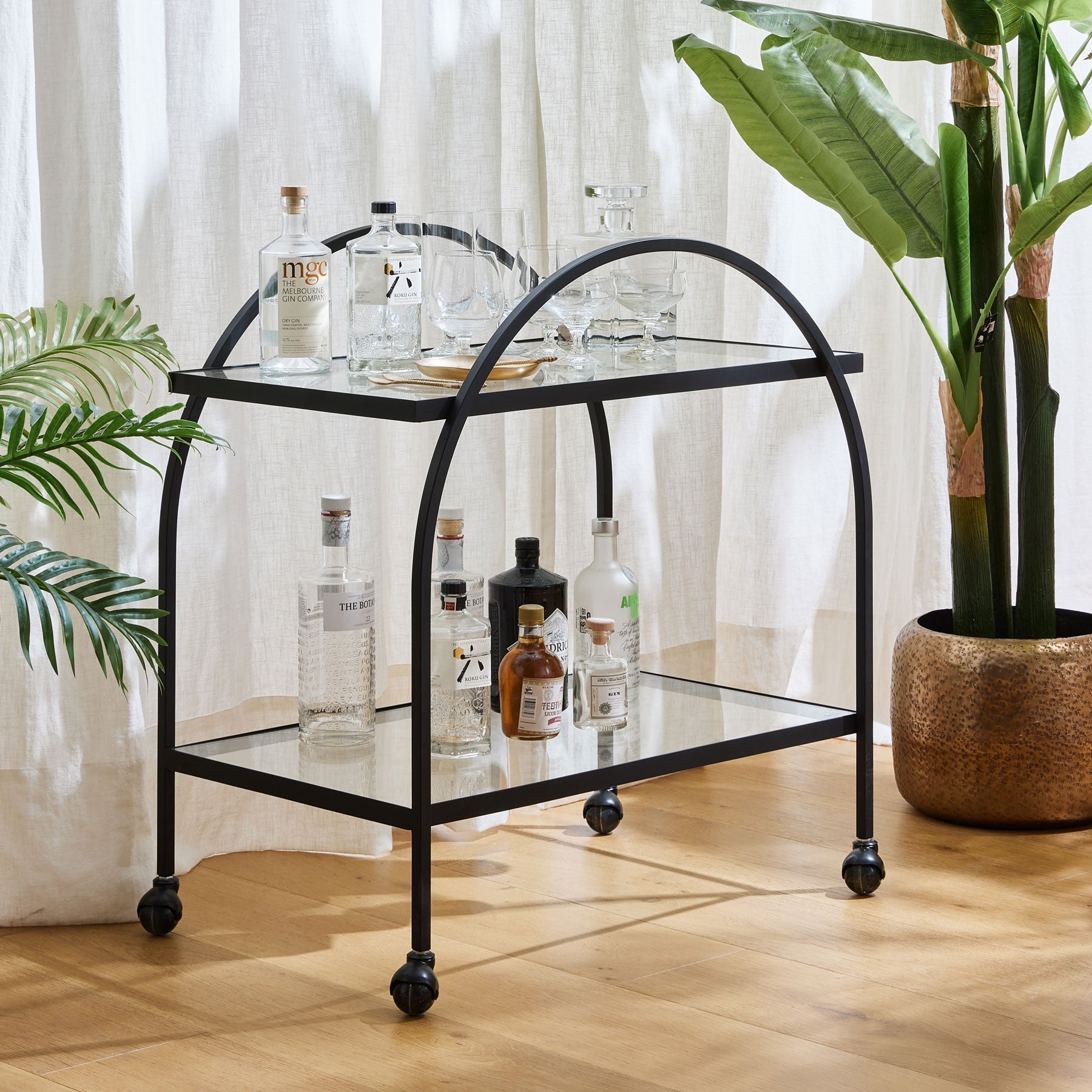 • Bring classic and elevated finishes to your evening drinks with our Ponte Brass Bar Cart. This spectacular piece features wide brass arches and two glass shelves so you can display and serve drinks in style.