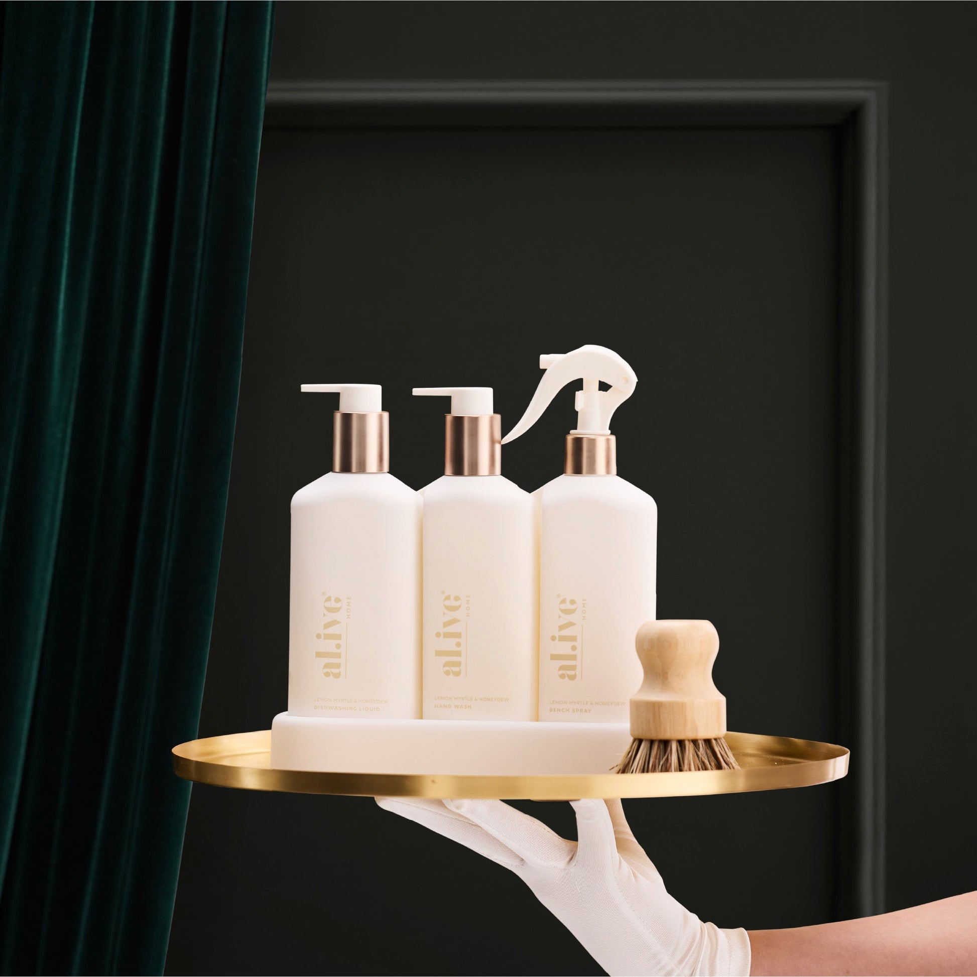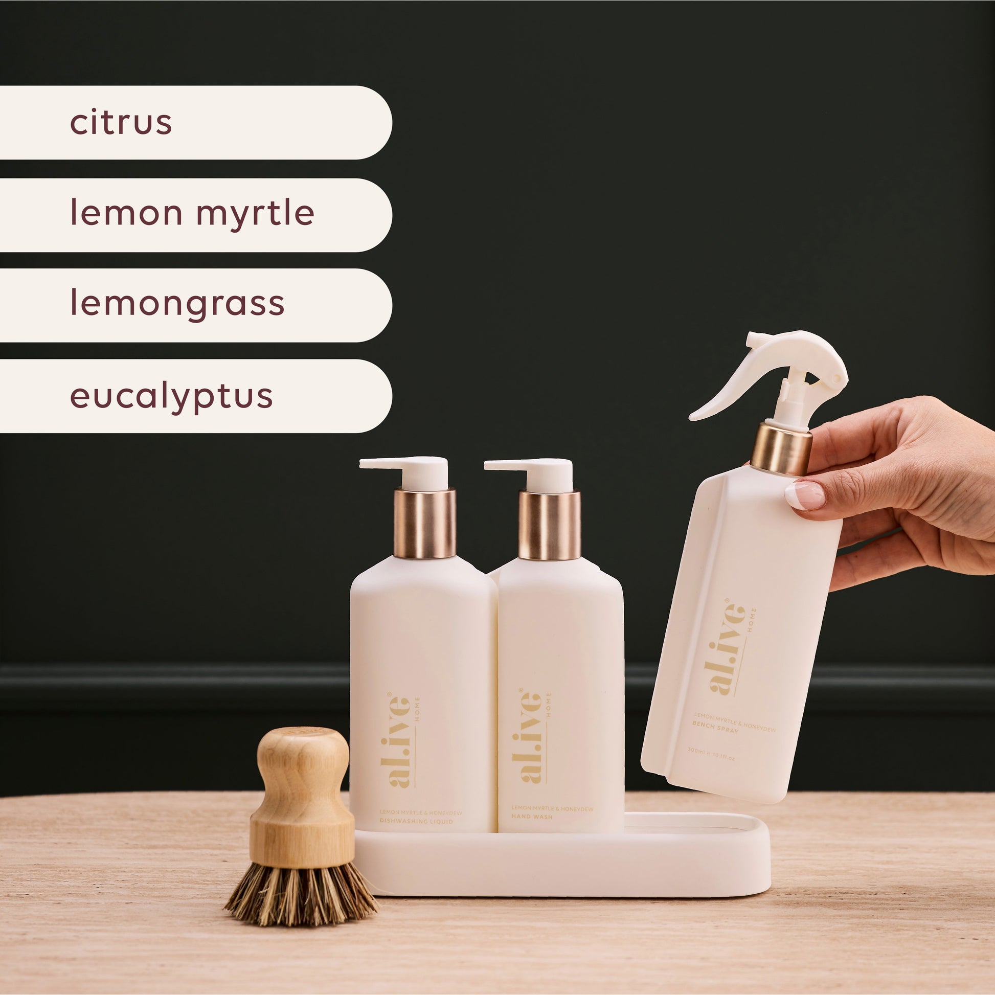Elevate your kitchen rituals with this thoughtfully curated trio in the exclusive Lemon Myrtle & Honeydew scent, complete with Dishwashing Liquid, Bench Spray, Hand Wash, and a natural bamboo dish brush.
