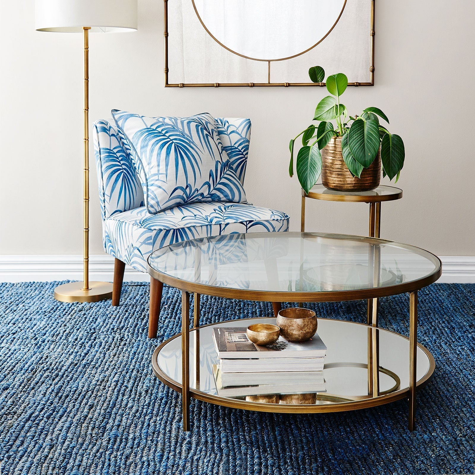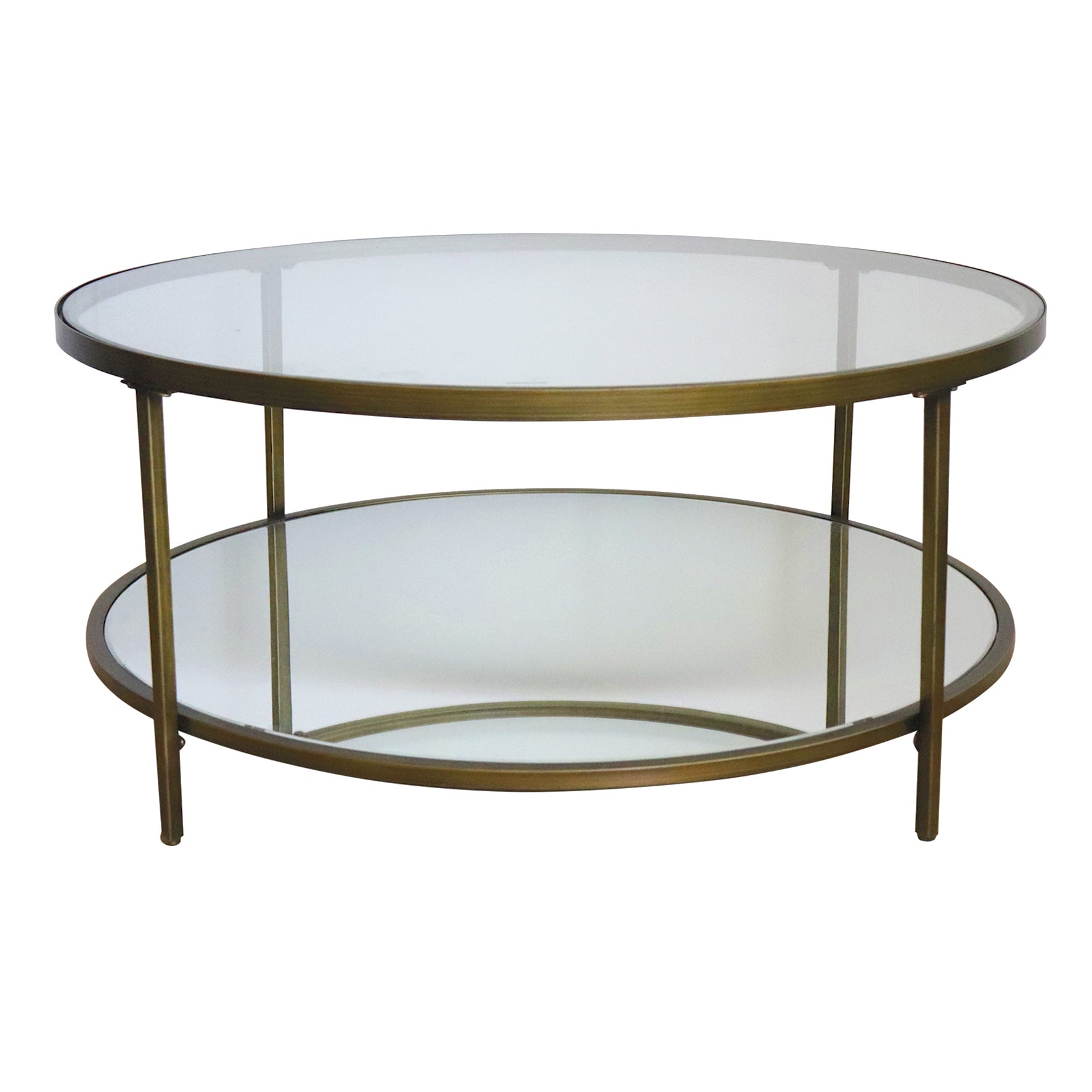 • Gold metal frame with mirrored bottom shelf and glass top shelf.