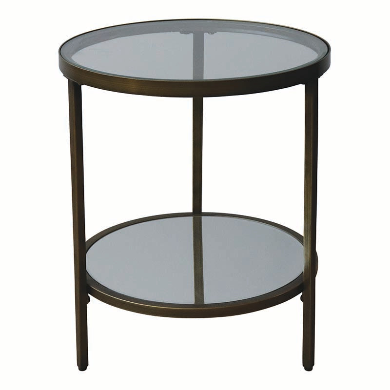 • Gold metal frame with mirrored bottom shelf and glass top shelf.