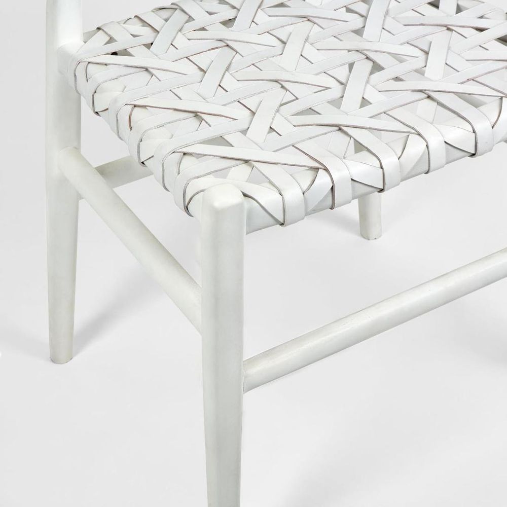 The teak wood hand-carved seat back and frame is finished in a matt white hand painted texture for a modern look.