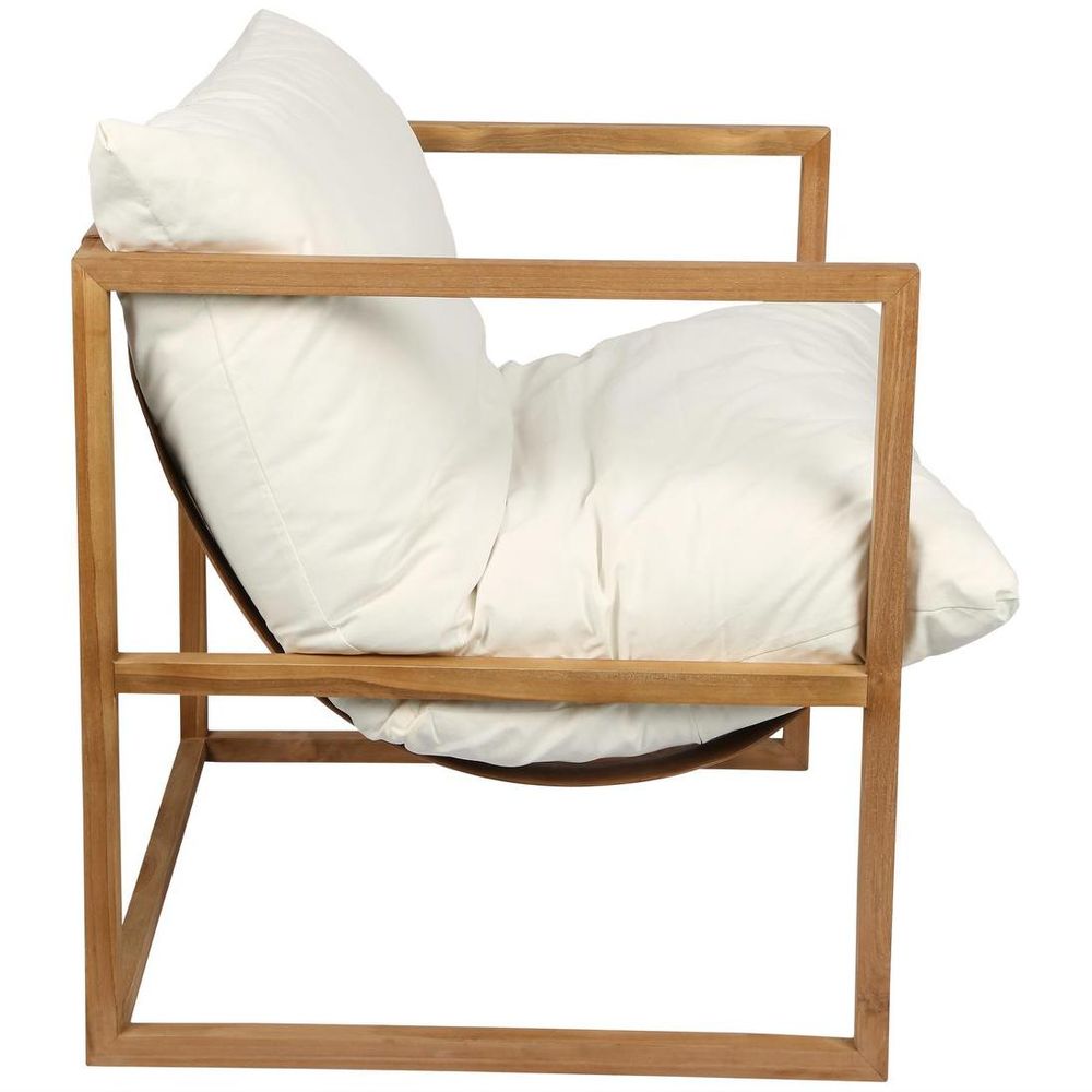 • What's not to love, a minimal teak frame with hand-stitched leather strapping supporting a sling seat with a  covered cushion. The fabric  is 100% Olefin  for  the ultimate layer of luxury and comfort, and at the same time hardwearing and easy to clean. The one-piece seat and back cushion is fibre filled, giving that soft comfortable sink-in feeling.