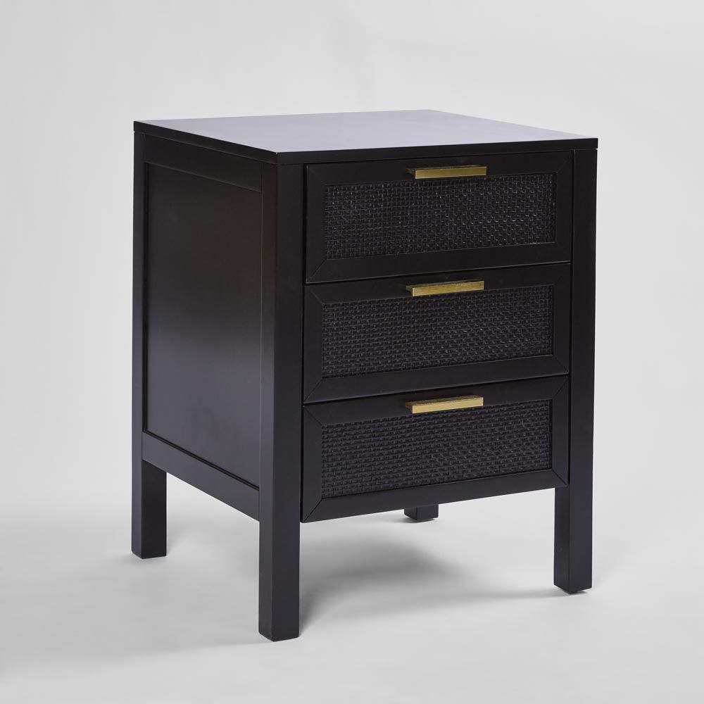 • Make your nighttime essentials accessible and stylish with our Santorini Bedside Drawer in Black. Crafted with a solid wood frame, this bedside table features three pull-out drawers, each accented with a chic gold drawer pull and charming rattan woven insert on the front. Perfect for keeping your nighttime essentials close at hand, this piece adds a touch of sophistication to any bedroom. For a cohesive and elevated aesthetic, pair it with other pieces from our Santorini collection.