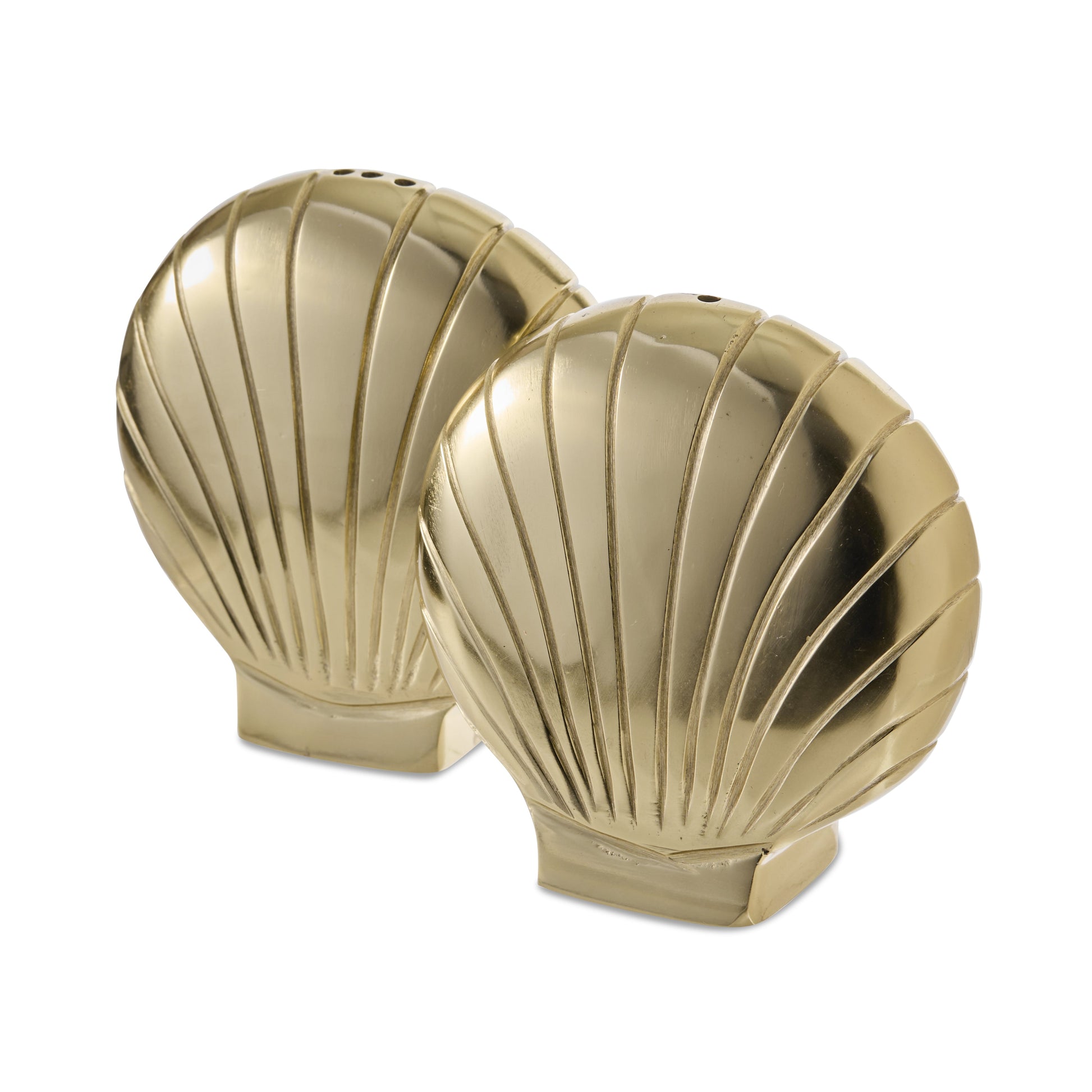 • Set of 2 shell shaped salt and pepper shakers in a gold finish.