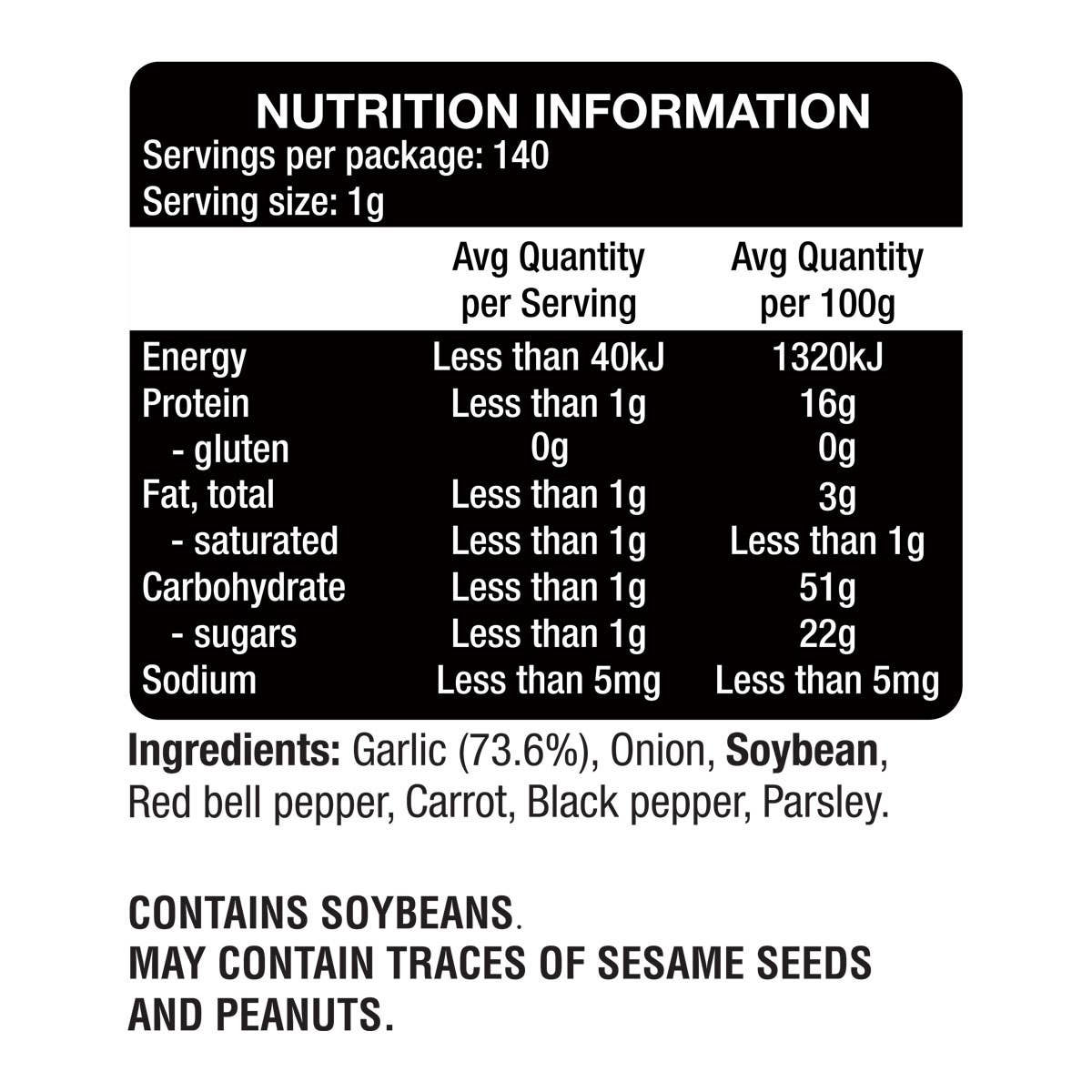 • The Gourmet Collection - Garlic Bread Spice Blend (156g) Yes! 70% Garlic!! Try that! SALT FREE! Yes, you really can try that – and you should! And not just with the obvious bread, but with anything you want to spice up with a great, healthy and zesty garlic taste. You see, it’s not just garlic; it’s garlic with just the right blend of everything else to make a whole that is greater than the sum of its parts. A friend suggested I should name the product after him because he uses it on everything. This one is special- actually, they all are, but you get the idea! Dietary Preferences: No Artificial Flavours, No Artificial Colours, Gluten-free