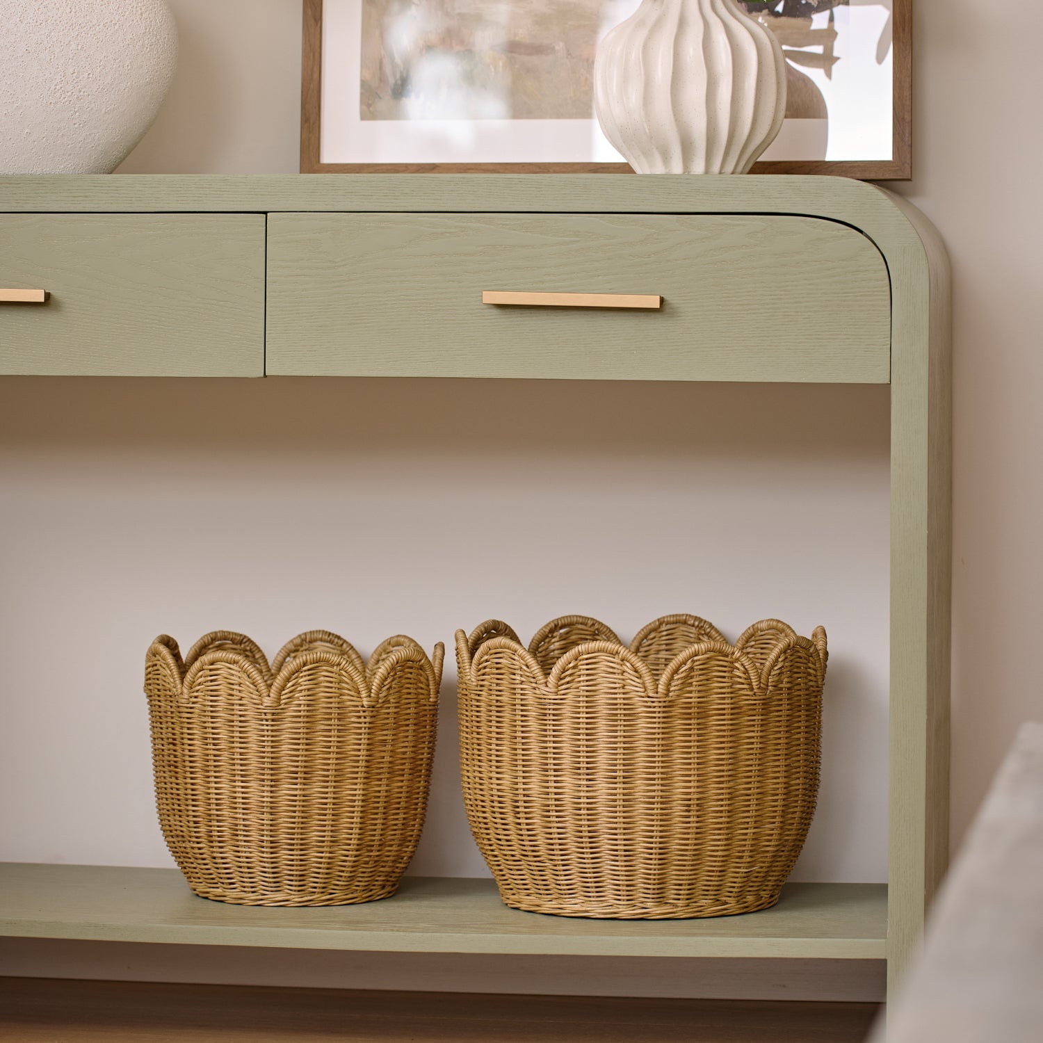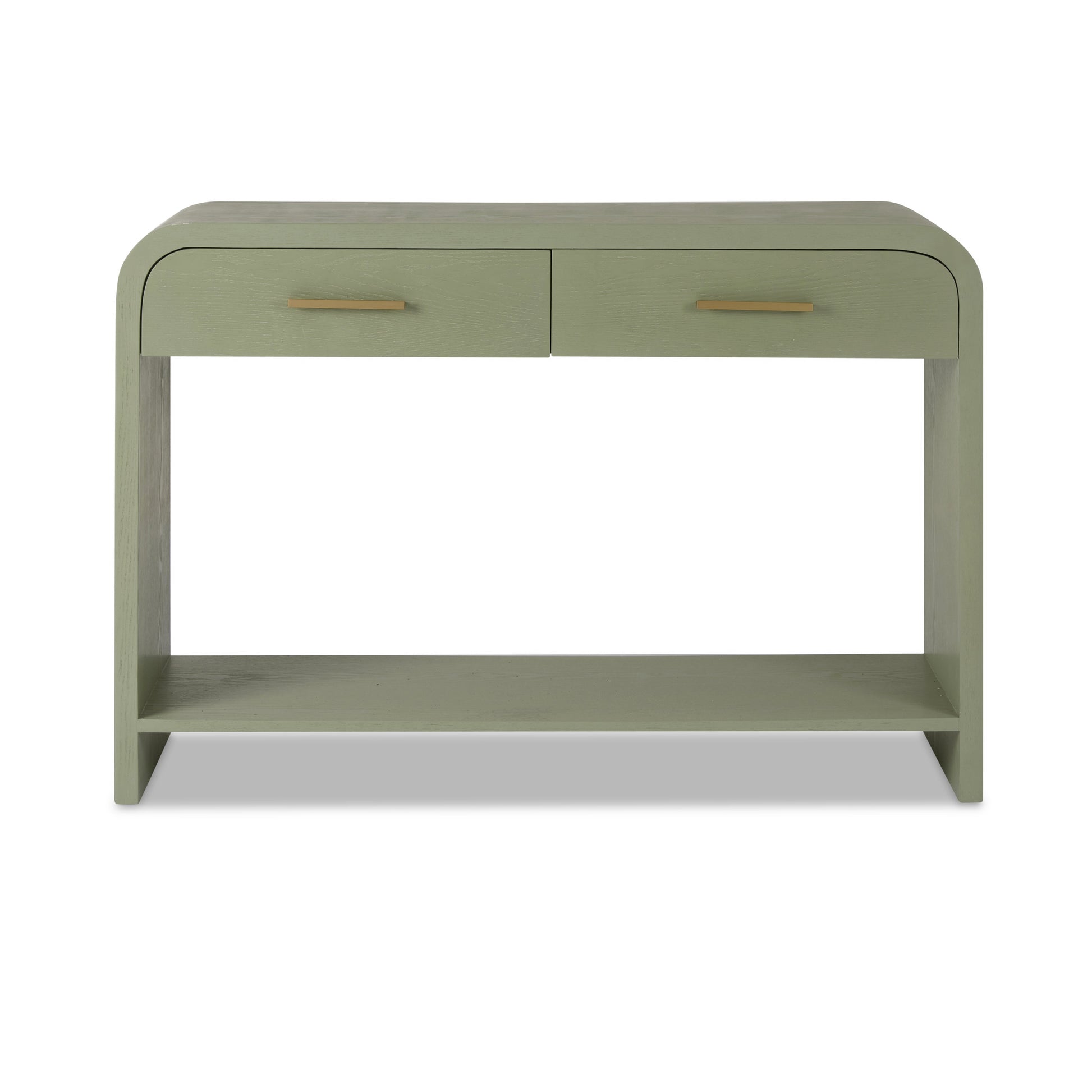 • Green curved console table with two drawers and lower shelf. Finished with gold handles.