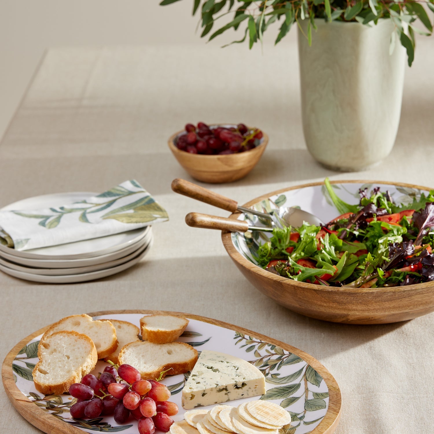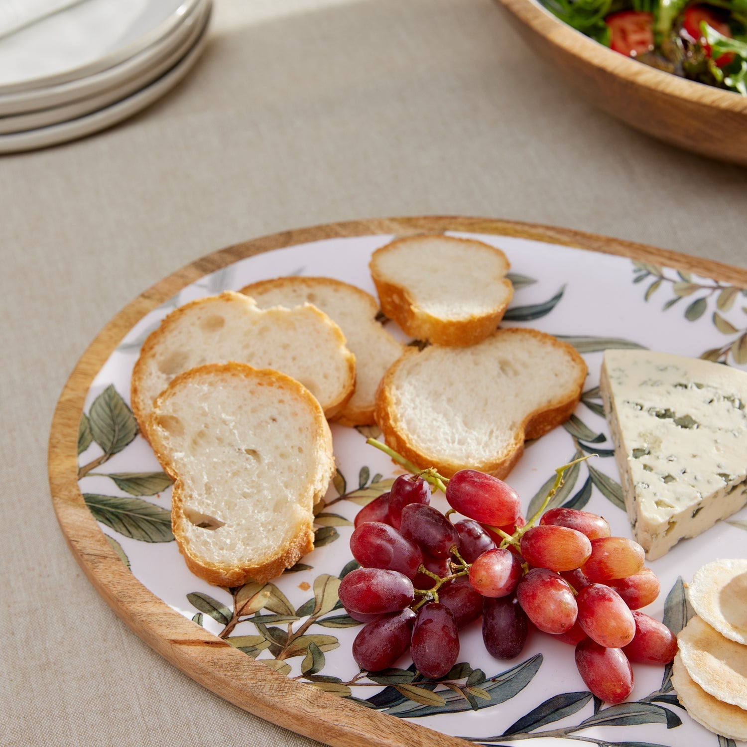 • Mango wood oval platter with food-safe enamel insert, printed with our hand-painted Waverly foliage design on white background.