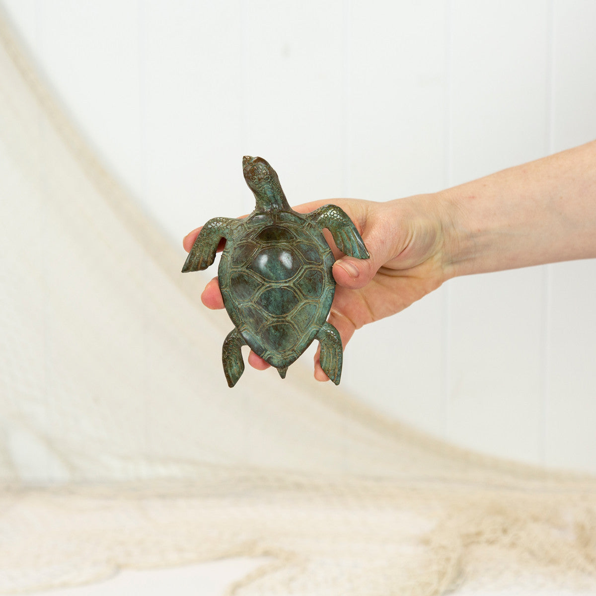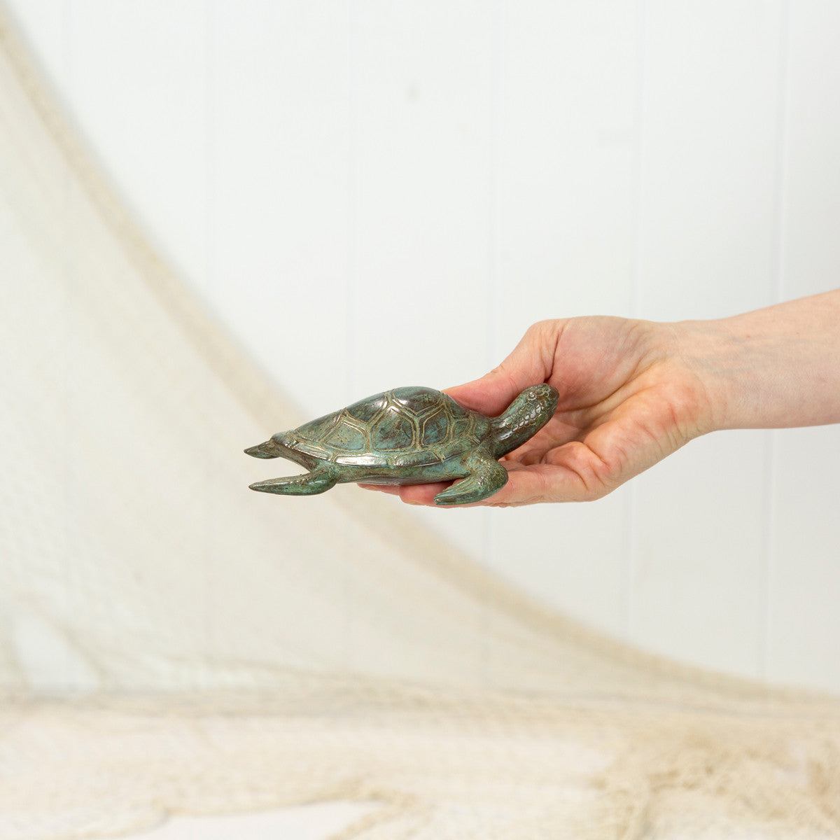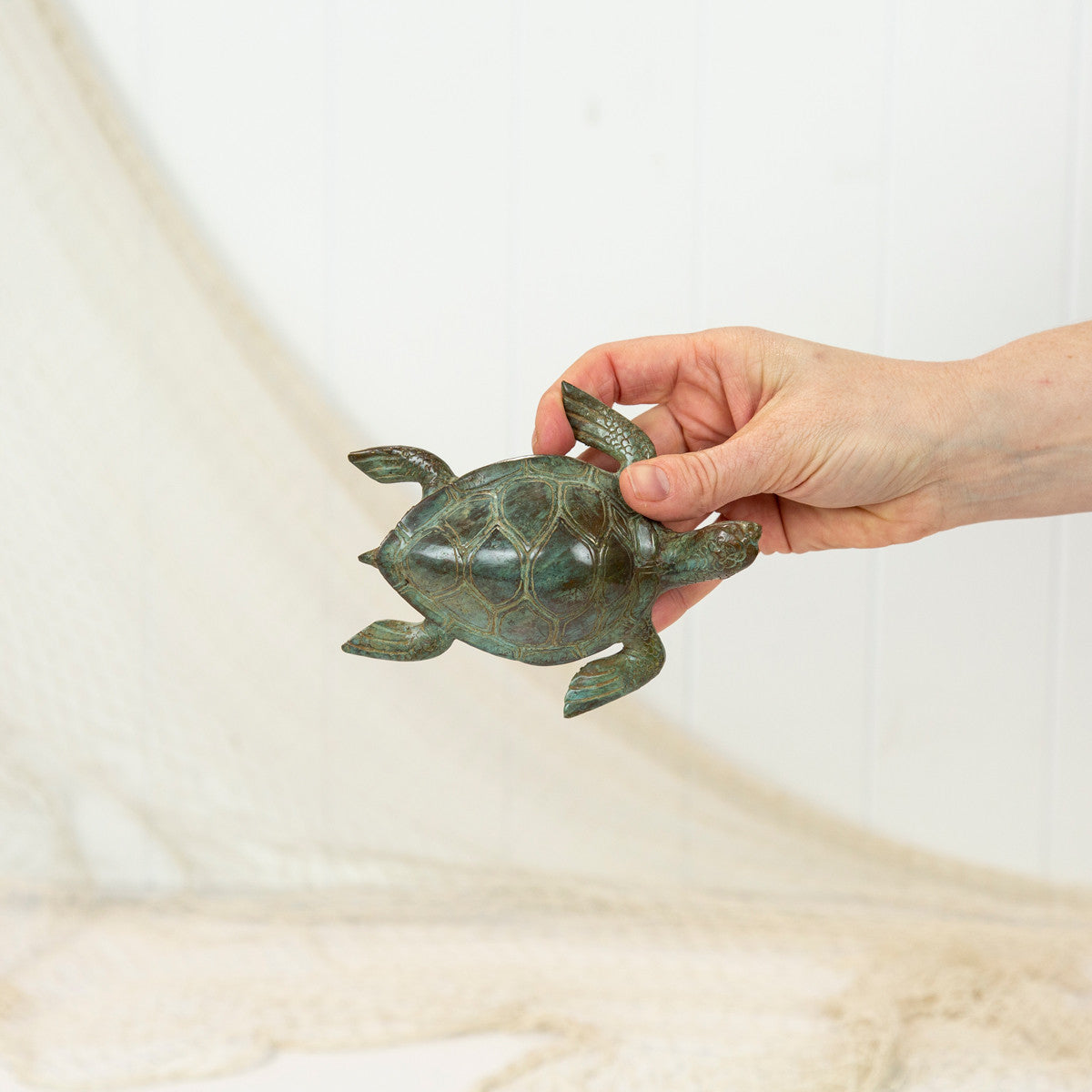 Beautifully detailed, the brass has been aged giving it a green patina. It would make a fabulous addition a coffee table or shelf.