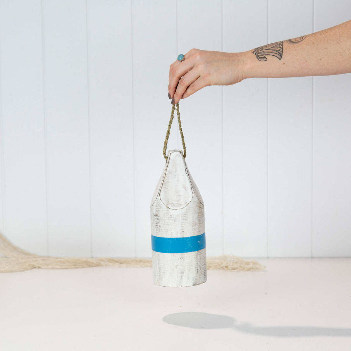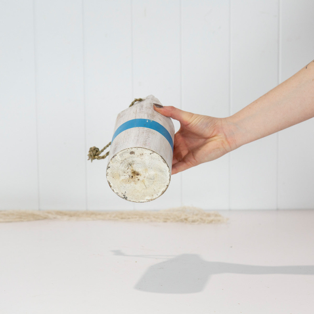 Painted white with a blue stripe, the top of the buoy has been carved to a point.