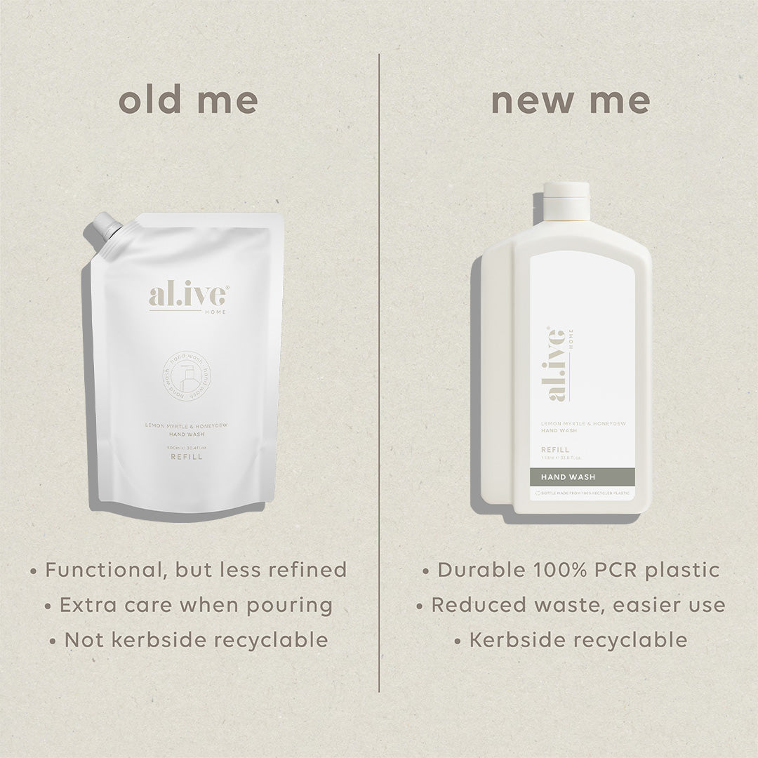 Each refill is designed to refill the 300ml al.ive body Hand Wash bottle over three times. With a controlled-flow spout for mess-free pouring, compact shape for easy storage, and full kerbside recyclability, it offers a practical, premium solution while extending the life of the product you already love.
