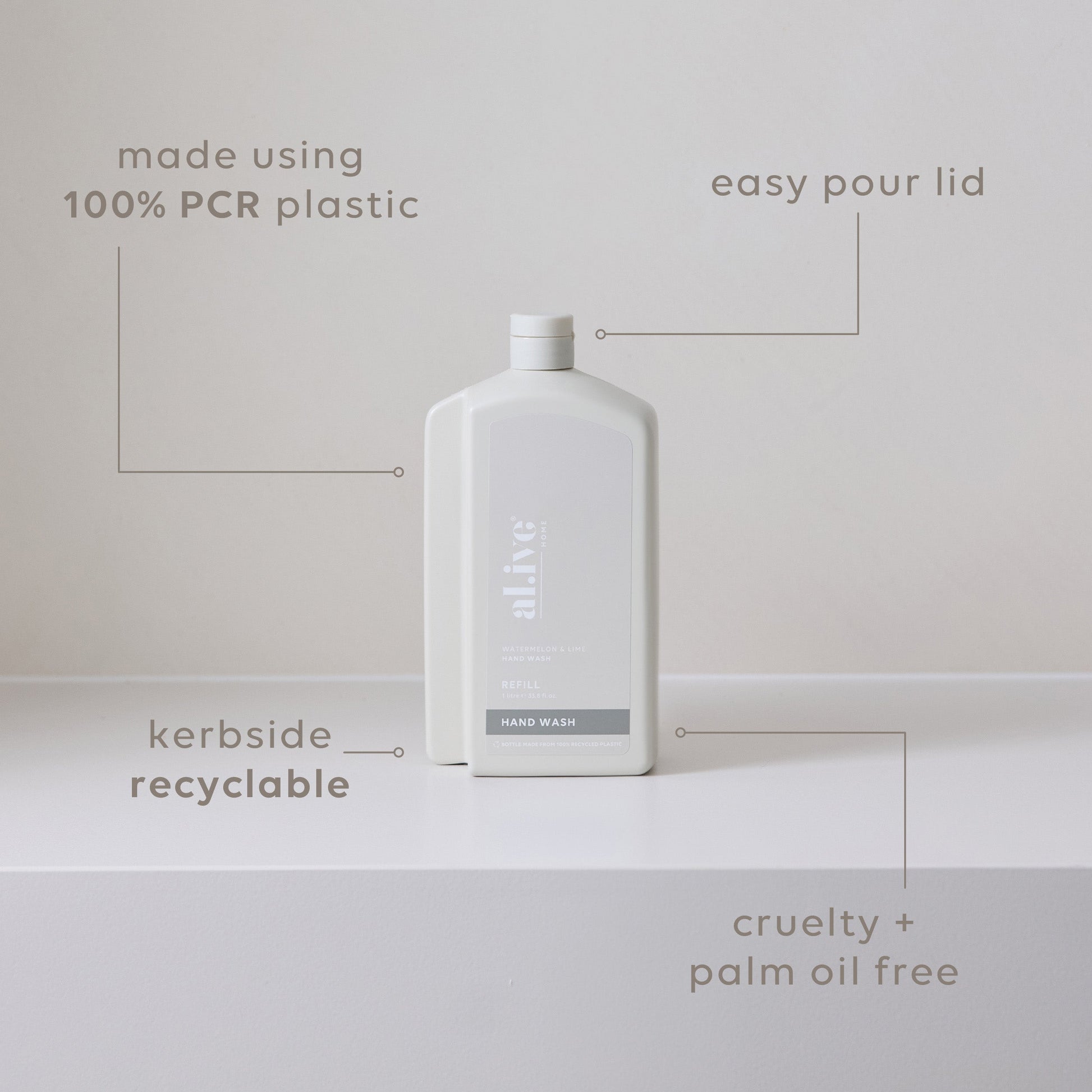 Our 1 L bottles are made from 100% Post-Consumer Recycled (PCR) HDPE plastic and are fully kerbside recyclable. The bottle label is made from PP with 30% post-industrial waste and can be left on during recycling. The cap is made from PP with a PE liner and is also recyclable when left attached.