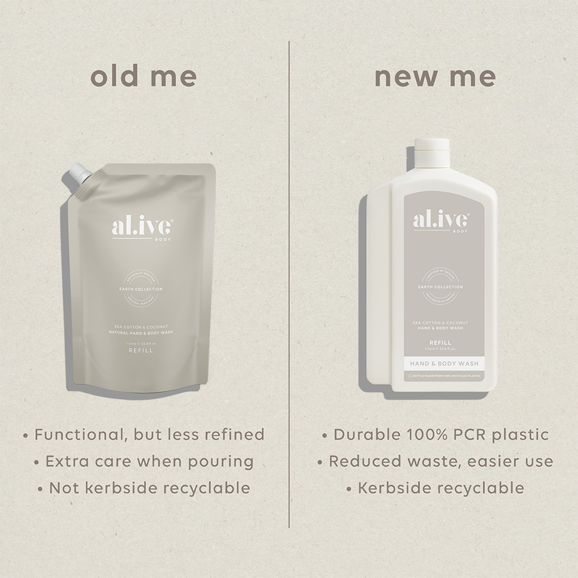 Each refill is designed to refill the 500ml al.ive body Hand & Body Wash bottle twice. With a controlled-flow spout for mess-free pouring, a compact shape for easy storage, and full kerbside recyclability, it offers a practical, premium solution that extends the life of the product you already love.