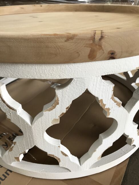 • A lattice pattern with a weathered white finish is the base for the round shape of this coffee table and is topped with a wooden tabletop with a whitewash natural finish. The mixed materials and textures of this piece will be a great addition to any living room. It will make a great centerpiece in your room. Made of  95% Fir Wood, 5% MDF Measurements are 81x81x40cmh  Weight 8kgs