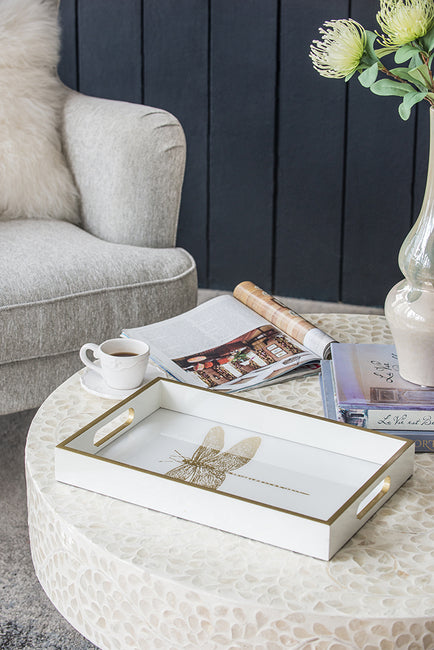 Dragonfly Serving Tray. 40Cm. Printed Gold Dragonfly Motif. Understated Elegance