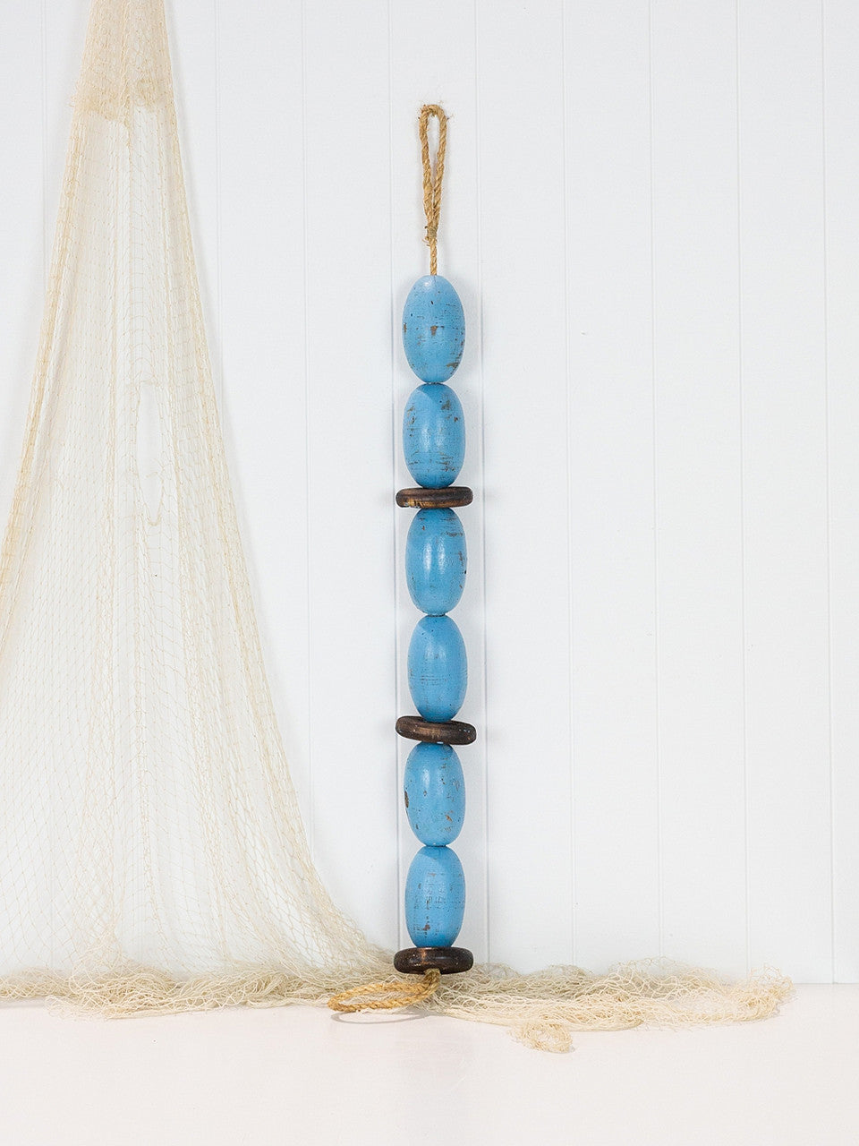 Each strand has six oval or egg shaped floats, and two wooden disks strung together on sisal rope.
