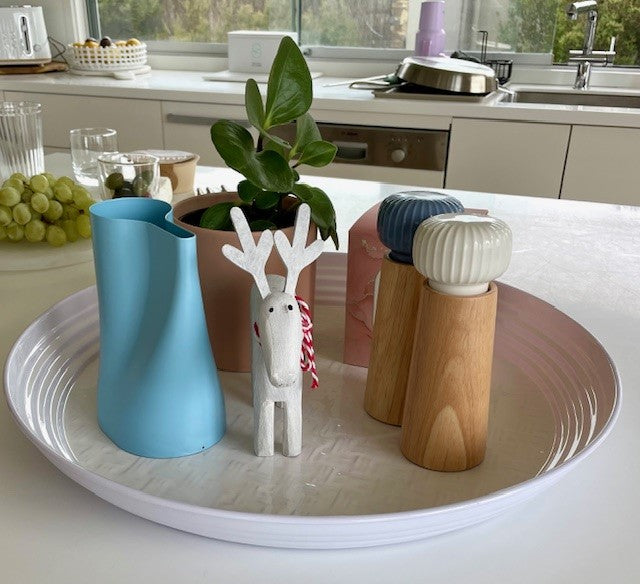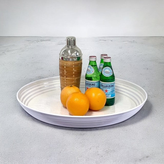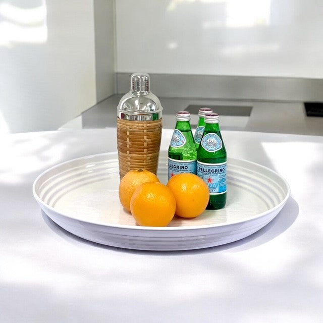• Experience luxury at its finest with our handcrafted BAMBOO LARGE SERVICE PLATTER WHITE. This premium platter features a stunning 100% safe-for-food bamboo design, elevating your dining experience with a touch of elegance and sophistication. Individually crafted using pressed tin, it exudes an air of exclusivity and refinement.