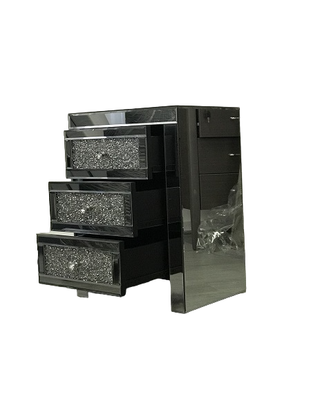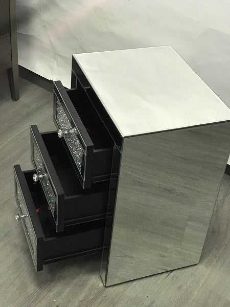 • This exquisite 3 drawer bedside with its bevelled edge glass panels & crystal fragment drawer fronts will enhance the look of any room.