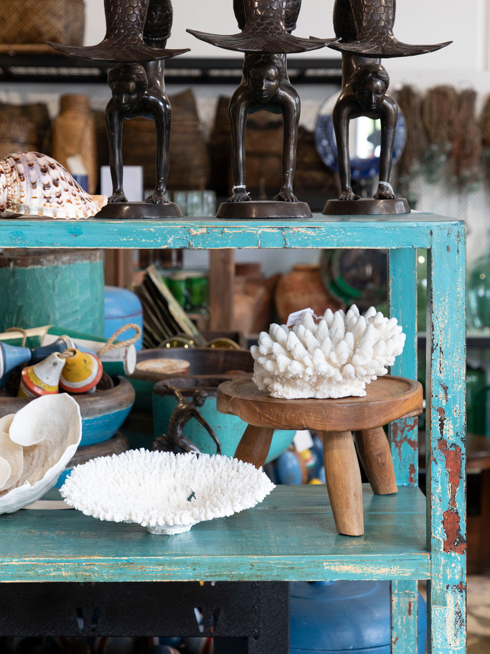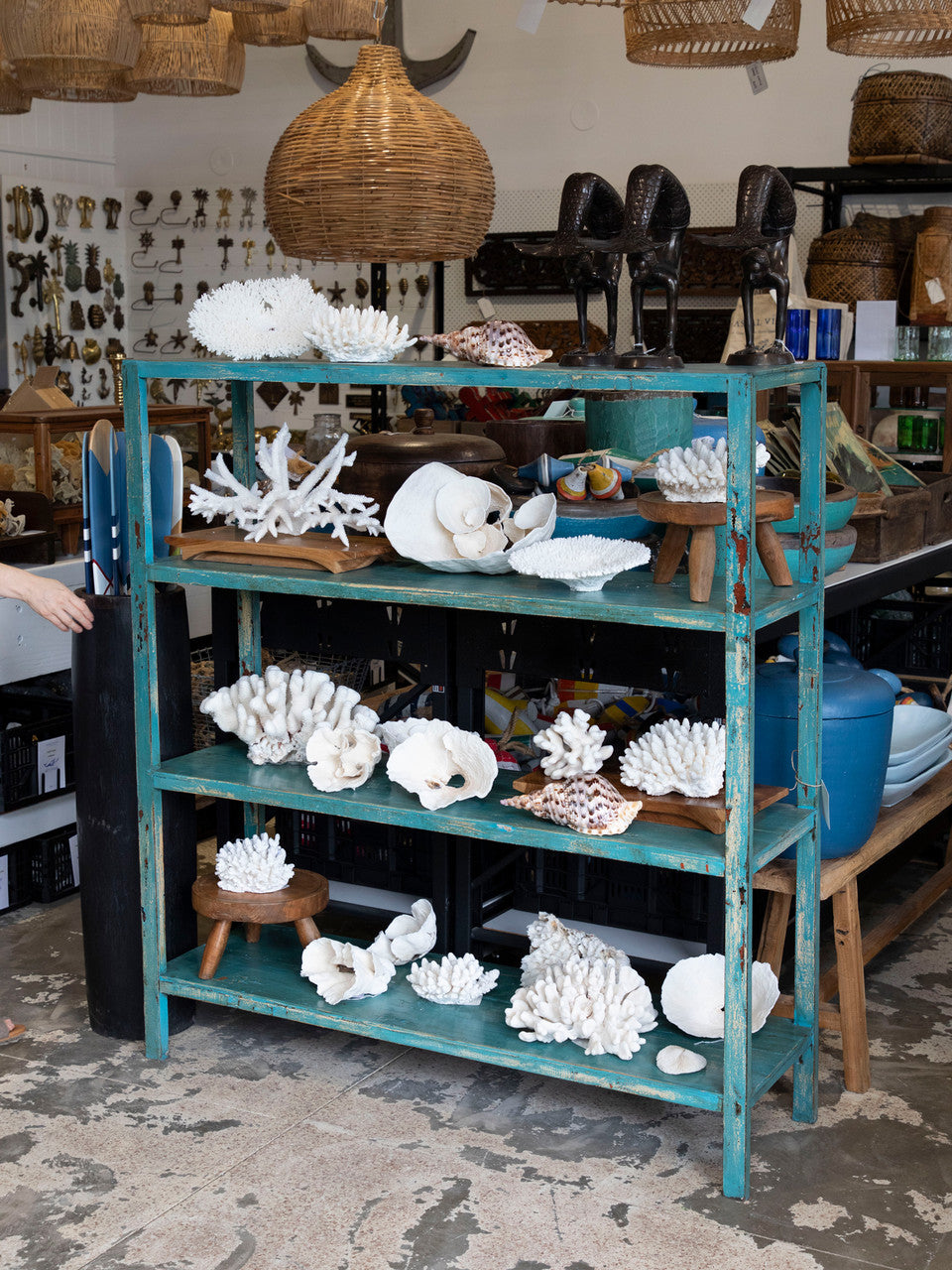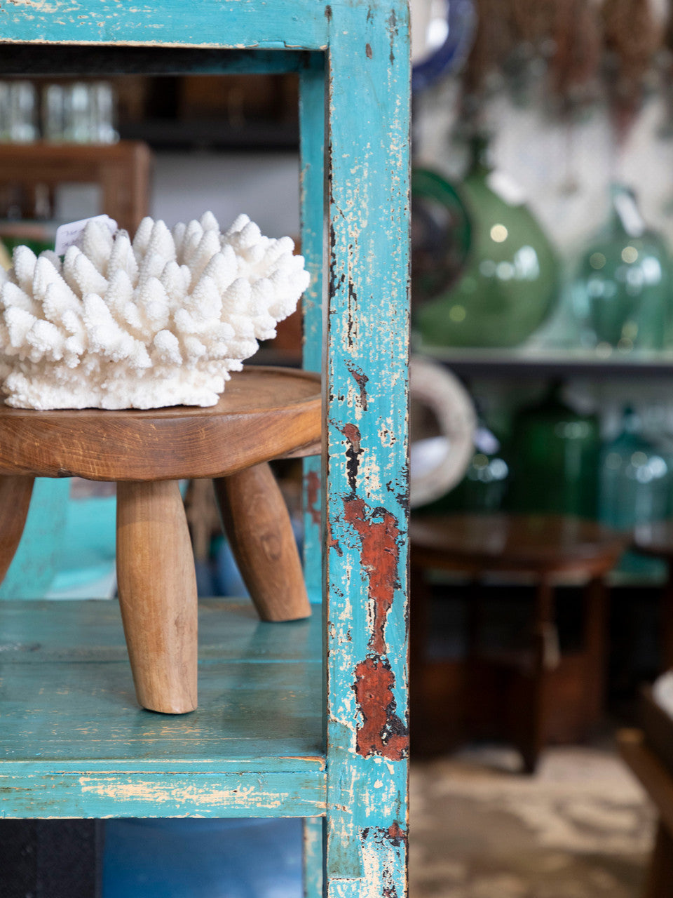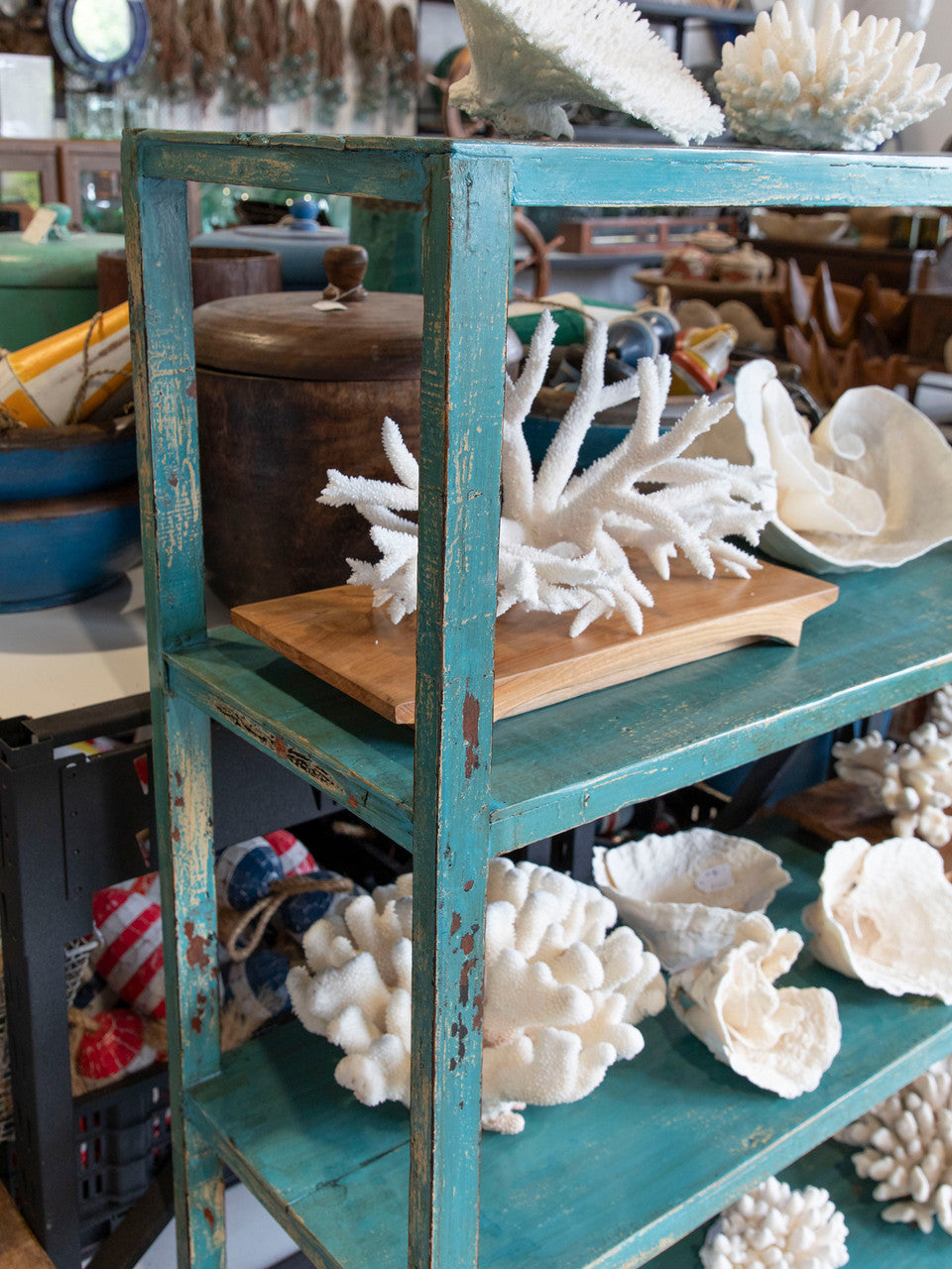 • This gorgeous old timber shelving unit has been painted the perfect shade of turquoise.