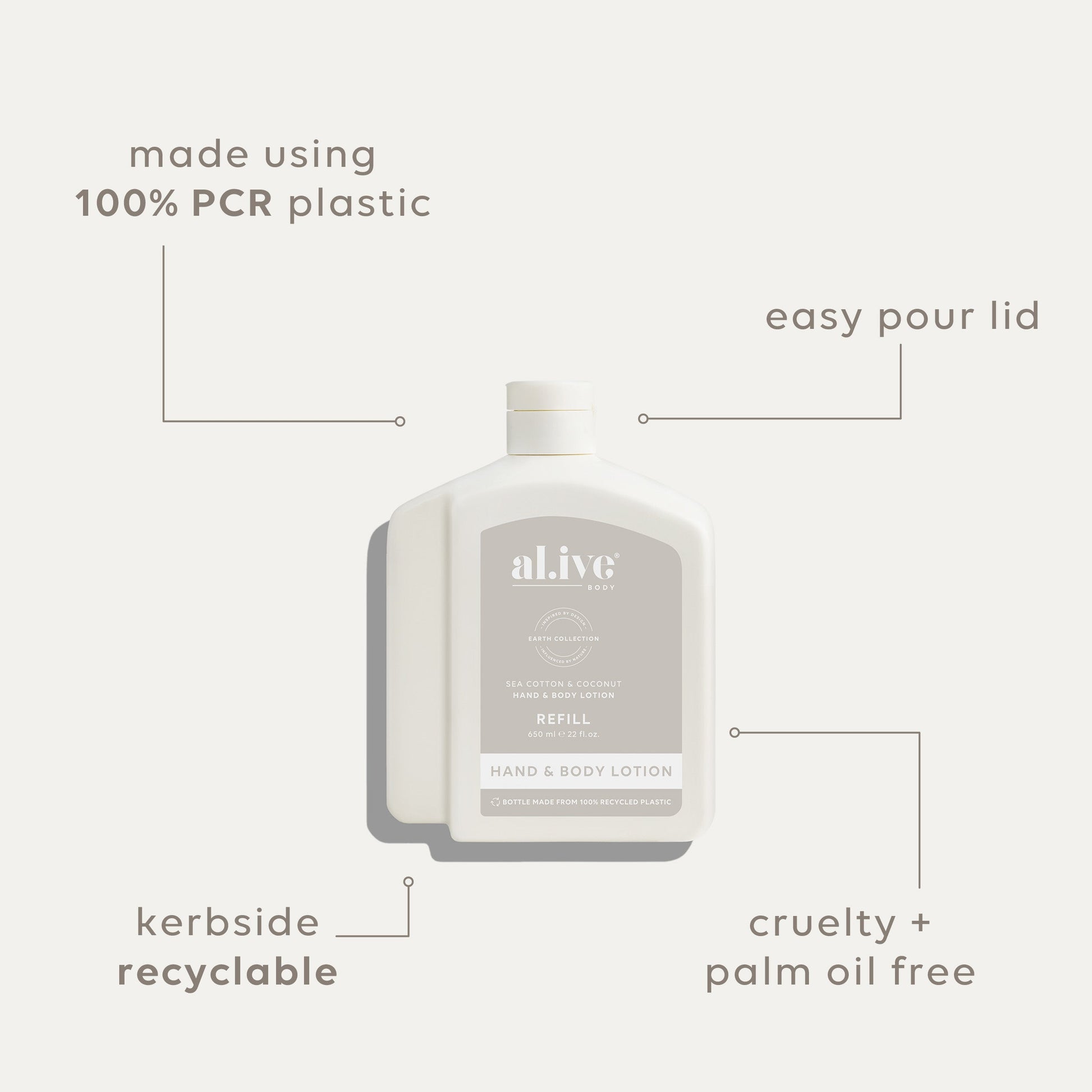Our 650ml Sea Cotton & Coconut Lotion Refill is housed in a durable bottle made from 100% post-consumer recycled (PCR) plastic.