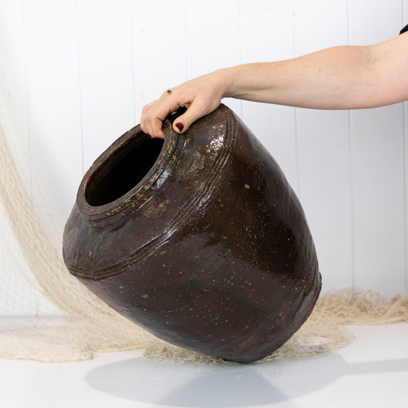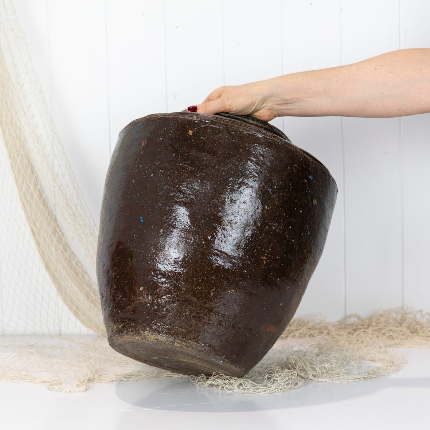 Used to carry goods for trade, it has a glossy dark brown glaze and irregular, handcrafted shape. a few specks of blue paint are scattered around the pot.