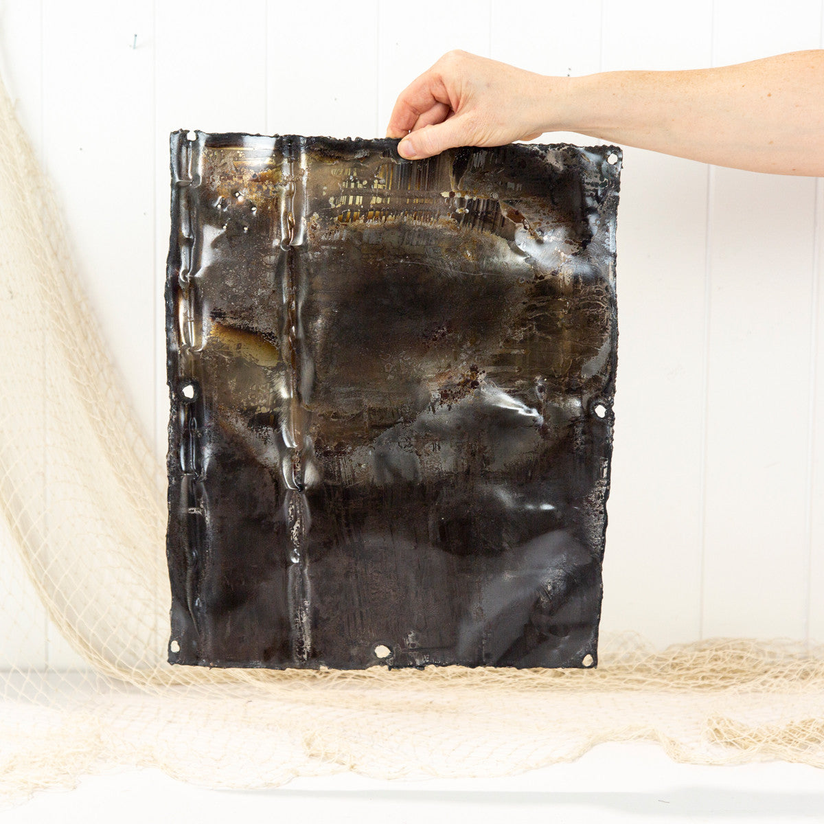 The metal is from an old oil drum which has been cut and rolled flat.