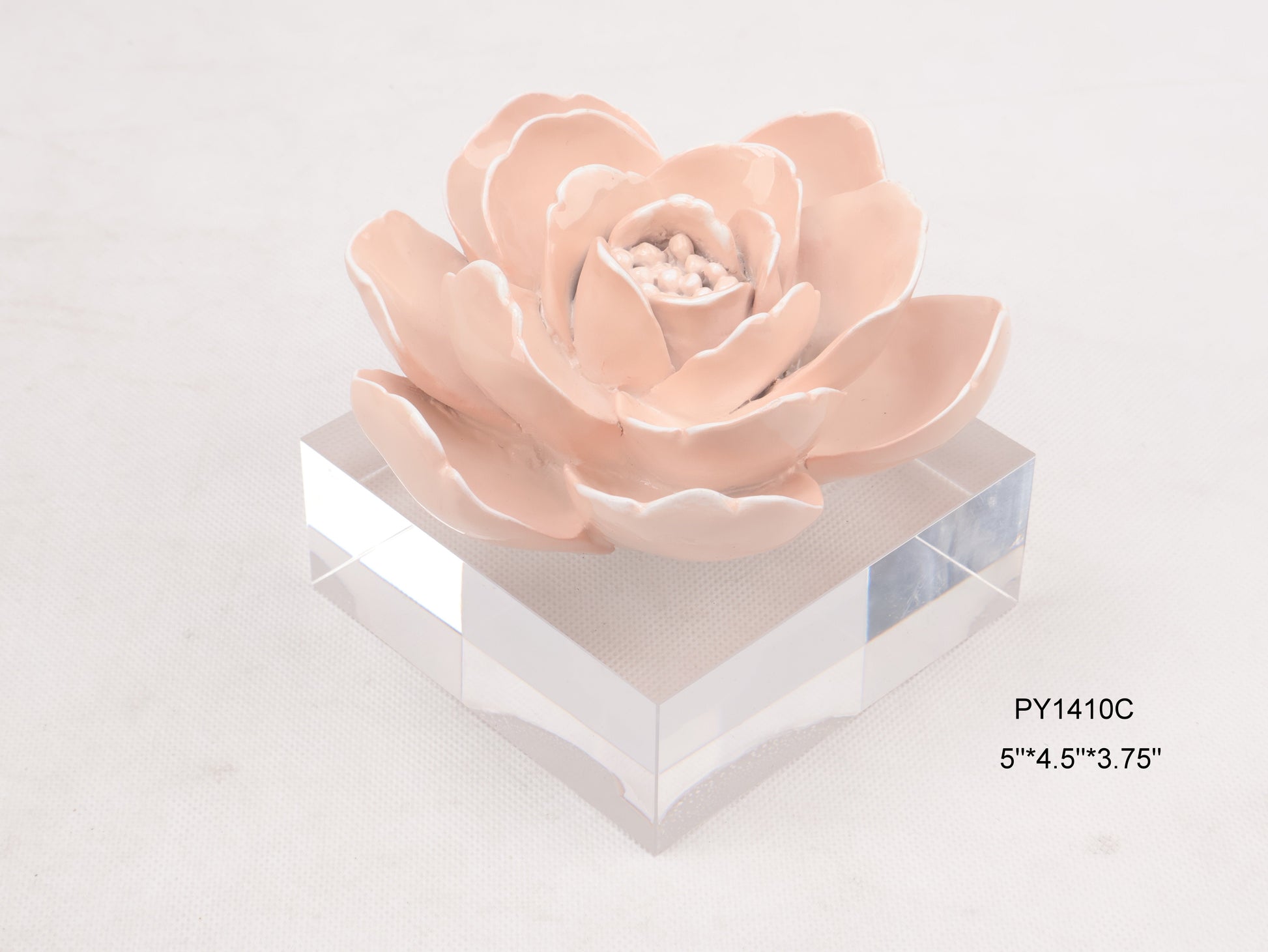 • Delicately crafted, this pink resin camelia flower rests gracefully on a clear acrylic base, blending timeless elegance with modern design. Its refined details bring a sophisticated touch to any space, making it a perfect accent for stylish décor or a thoughtful gift.