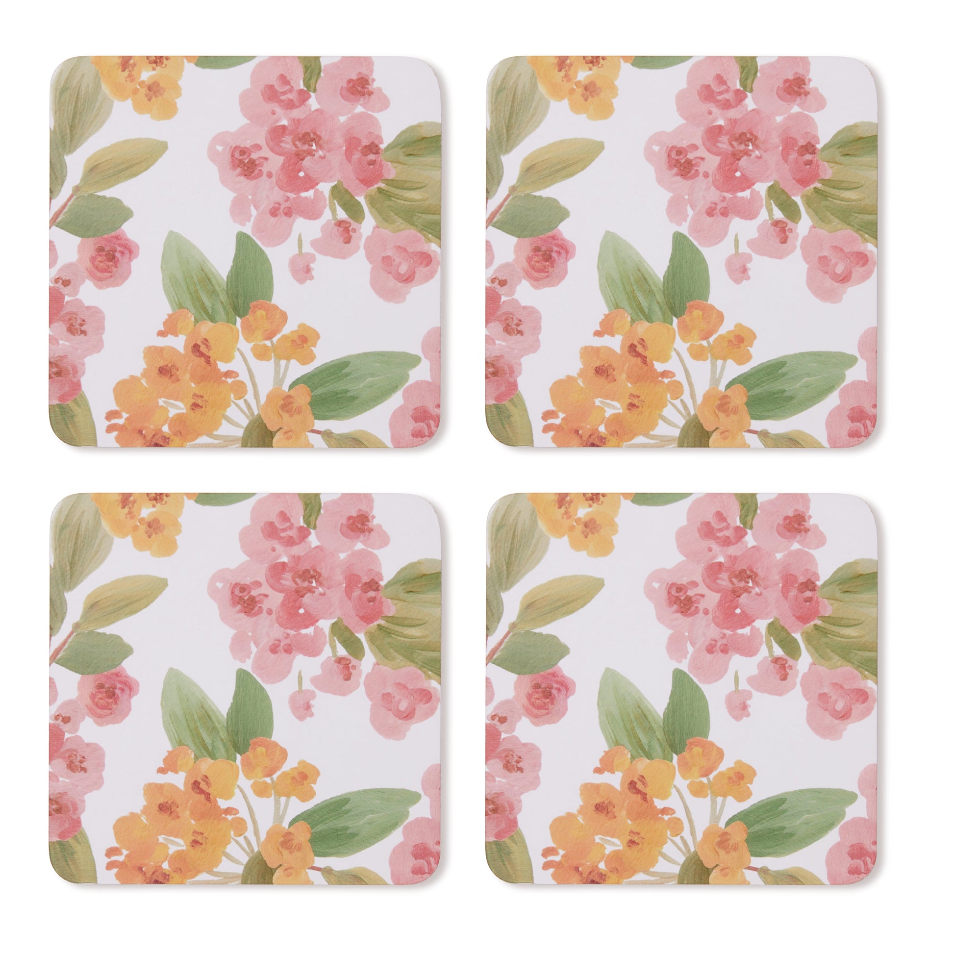 • Colourful floral print with white background printed on a wipe-clean hard coaster.