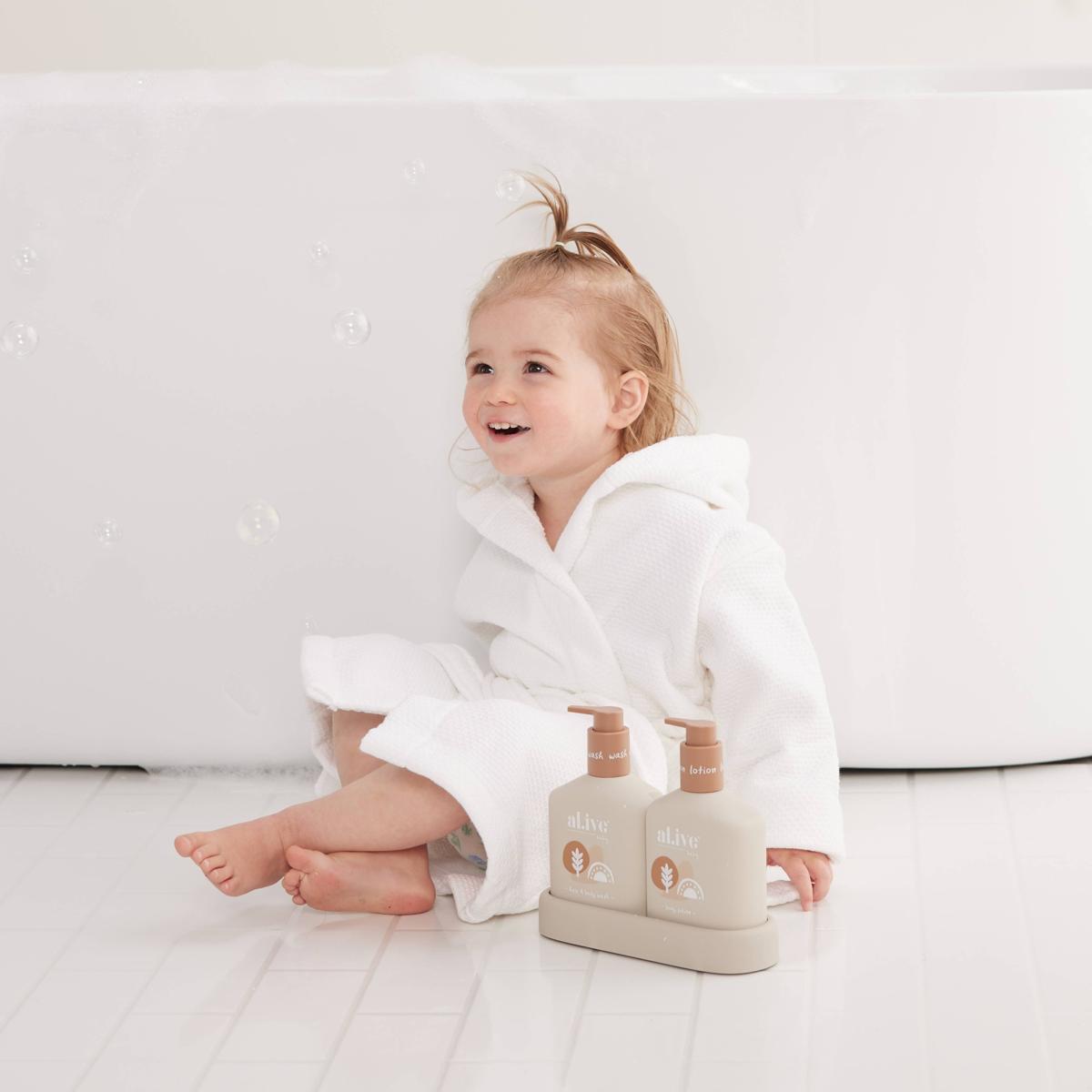 The al.ive baby Hair and Body Duo in Calming Oatmeal contains a Baby Hair and Body Wash and Body Lotion, both housed in a convenient non-slip tray with easy-to-pump lids. The formula is vegan, cruelty-free, and palm oil-free, and contains naturally derived ingredients that are gentle on the skin.