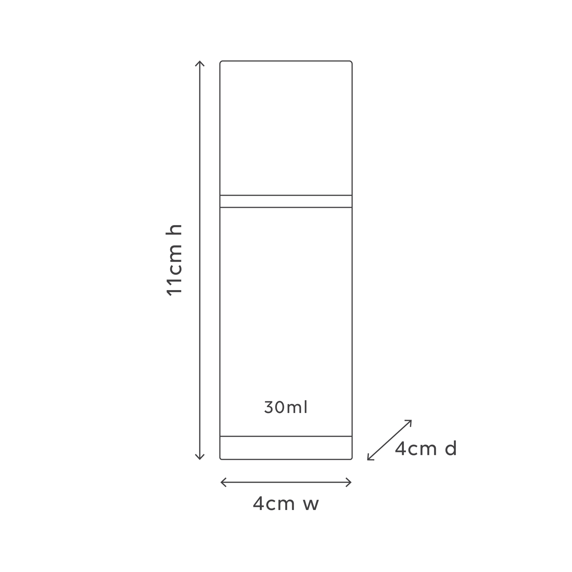 Our 30ml bottles are made from durable PP plastic and feature a refillable inner vessel. The box, inner bottle, and both caps are recyclable. The outer bottle and pump should be disposed of thoughtfully in general waste.