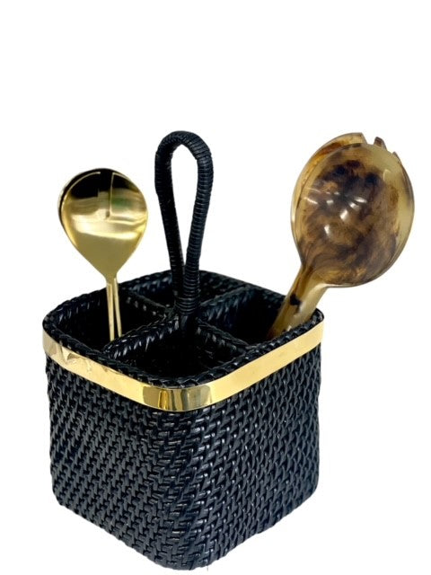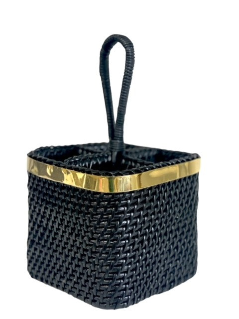 The St. Barts Black and Gold Cutlery Caddy is the embodiment of elegance and practicality. Crafted from handwoven rattan in a lustrous black hue with brass accents, this square-shaped caddy boasts a tall handle for easy carrying. Its interior features four compartments, perfect for bringing your cutlery to the dining table or storing sauce bottles. This versatile piece is not limited to the kitchen; it can also be used in your home office or studio to keep your art supplies organized and within reach. Not only is this caddy functional, but it also adds a touch of sophistication with its intricate woven details. Whether used for table setting or decluttering, this storage caddy exudes style and simplicity. Its overall dimensions are 17cm tall and 17cm square.