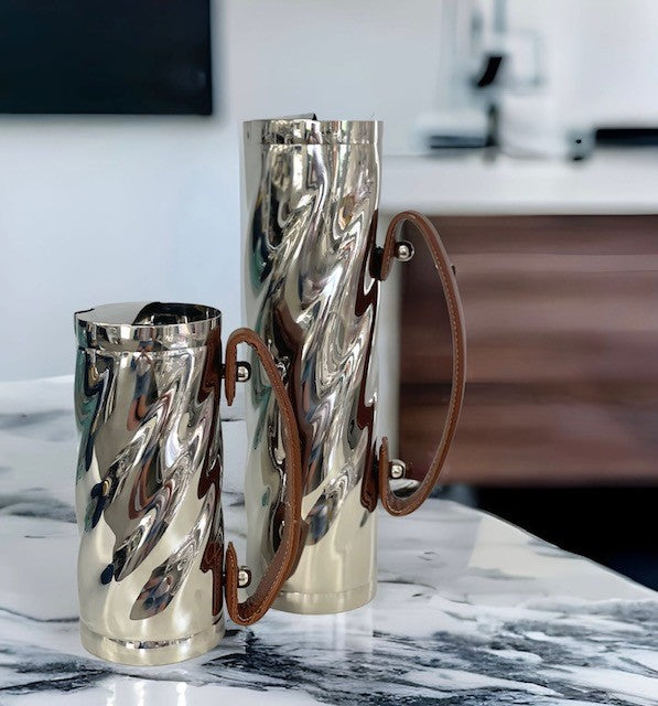 • Elevate your table setting with this small twist jug, featuring a rich brown leather handle for a refined touch. Its elegant design combines functionality with style, offering an easy grip while enhancing your home décor. Perfect for serving beverages with sophistication and charm.